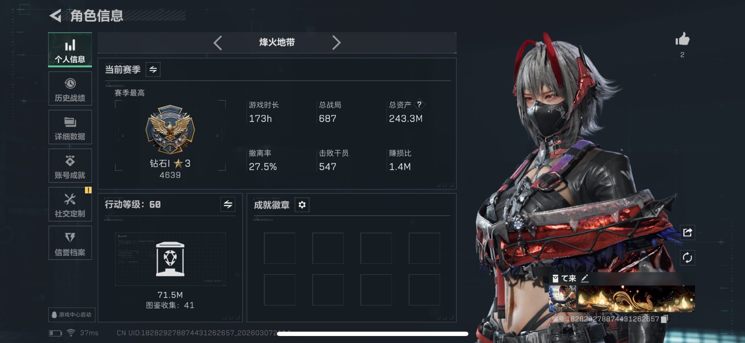 243m总资产-51483k哈伏币-60烽火等级-钻石-1战场等级-无军衔