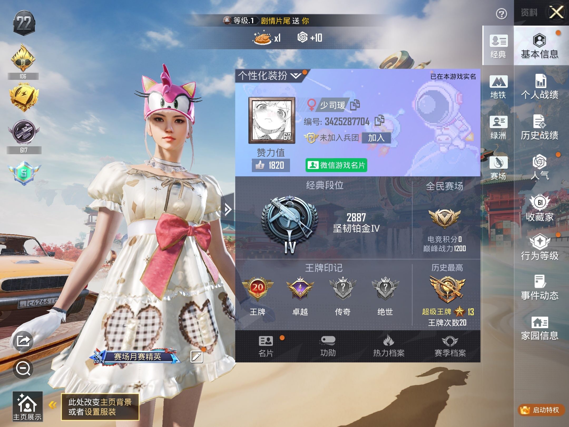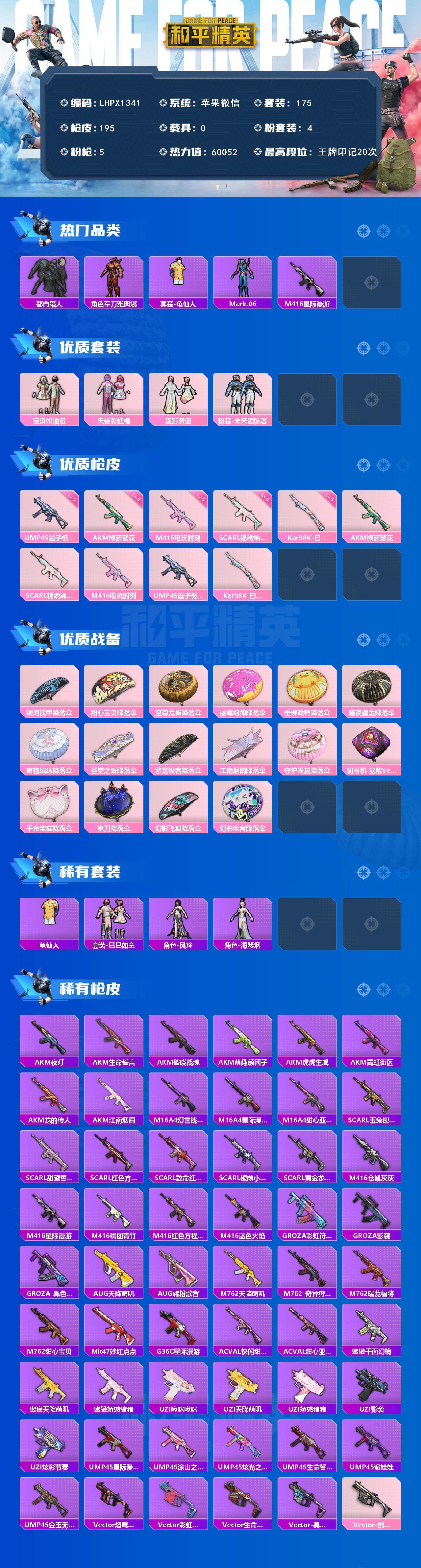 苹果 微信-4粉装-5特效枪-0载具-0粉色飞行器-60052热力值-20王牌印记-175套装-195枪皮