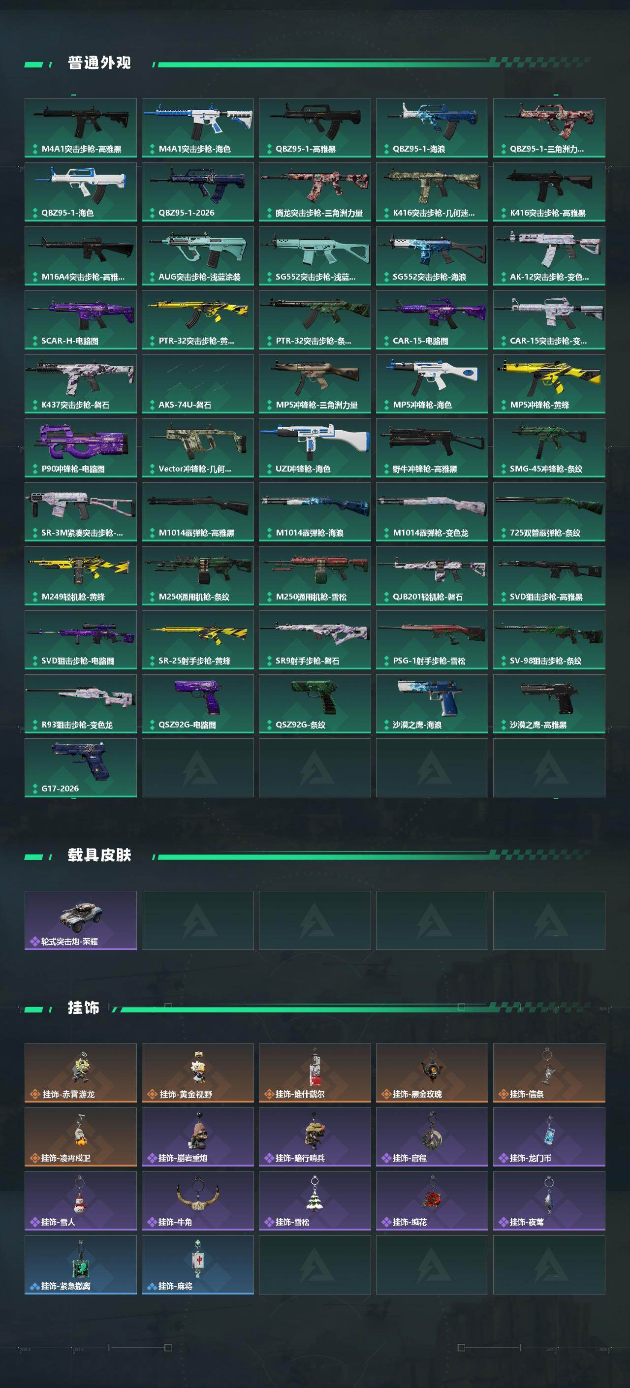 【传说外观】:M4A1突击步枪-蚀金玫瑰,M4A1突击步枪-阿米娅,K416突击步枪-行动记录,SG552突击步枪-运动员,SCAR-H战斗步枪-启航,G3战斗步枪-骑士,CAR-15突击步枪-阿米娅,KC17突击步枪-电锯惊魂,P90冲锋枪-信条,M250通用机枪-骑士之心,M14射手步枪-