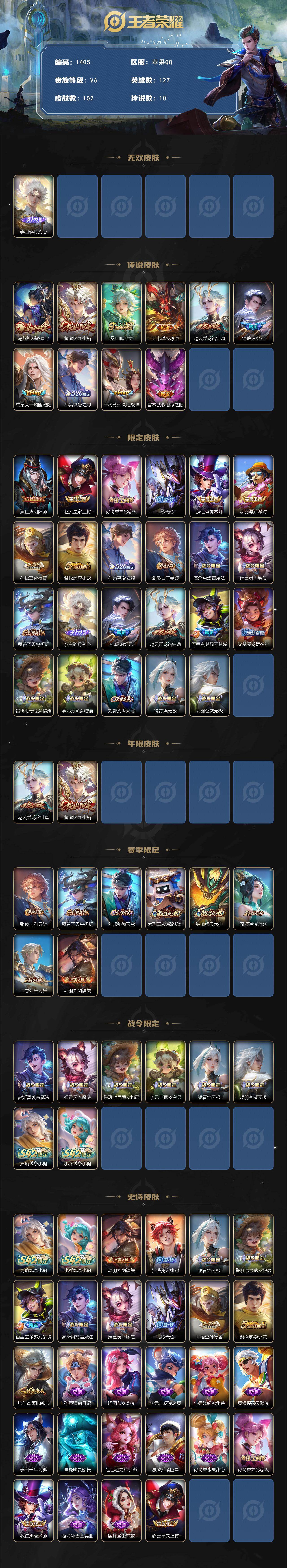 /2433511 王者荣耀账号 苹果Q-V6-最强王者段位-127英雄-102皮肤-1无双-10传说-26史诗