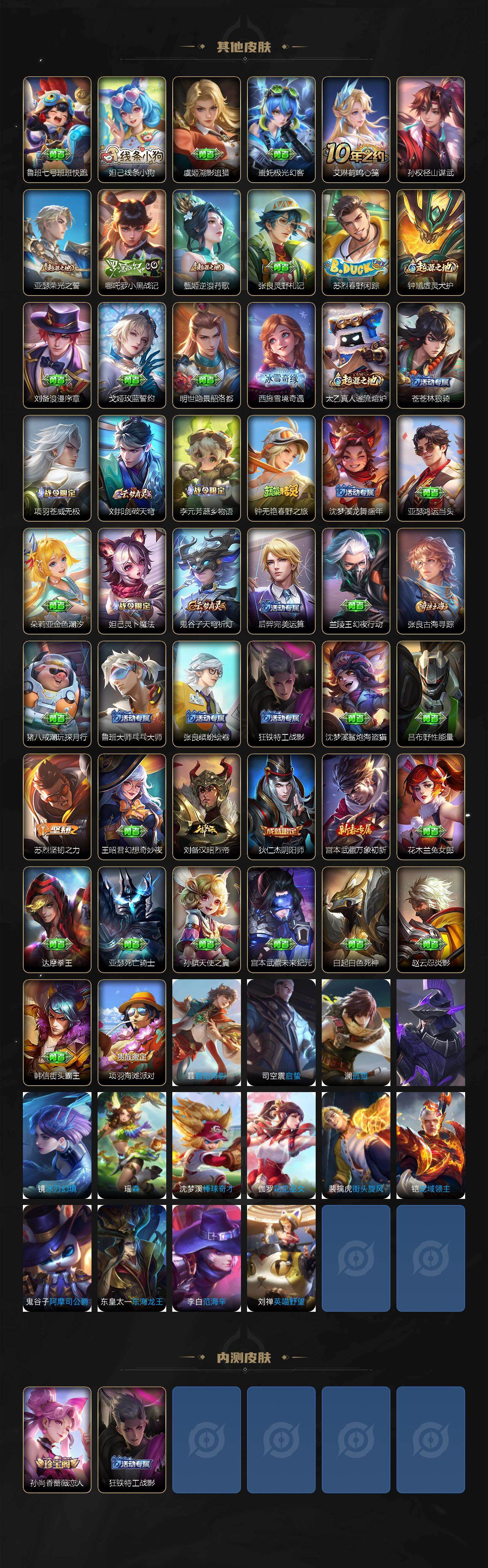 【传说皮肤】:马超神骥逐星野,澜愿照九州拓,桑启鸣野蒿,典韦战鼓燎原,赵云乘龙铭钟鼎,铠琥珀纪元,东皇太一灼幽烈阳,孙策挚爱之约,干将莫邪久胜战神,宫本武藏地狱之眼