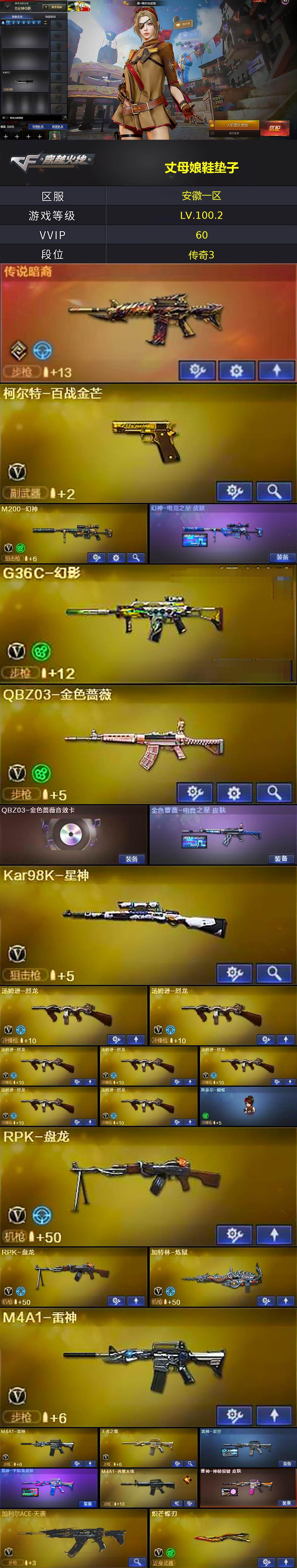 【热门武器】:传说暗裔,G36C-幻影,QBZ03-金色蔷薇,HK417-朱雀,M200-幻神,死亡之眼,荣耀世冠-火麒麟,王者炎心,Kar98K-星神,汤姆逊-烈龙*7,RPK-盘龙*2,加特林-炼狱,斯泰尔-蝴蝶,沙鹰-修罗*5,炽芒蝶刃,荣耀世冠-龙啸,金刚伞