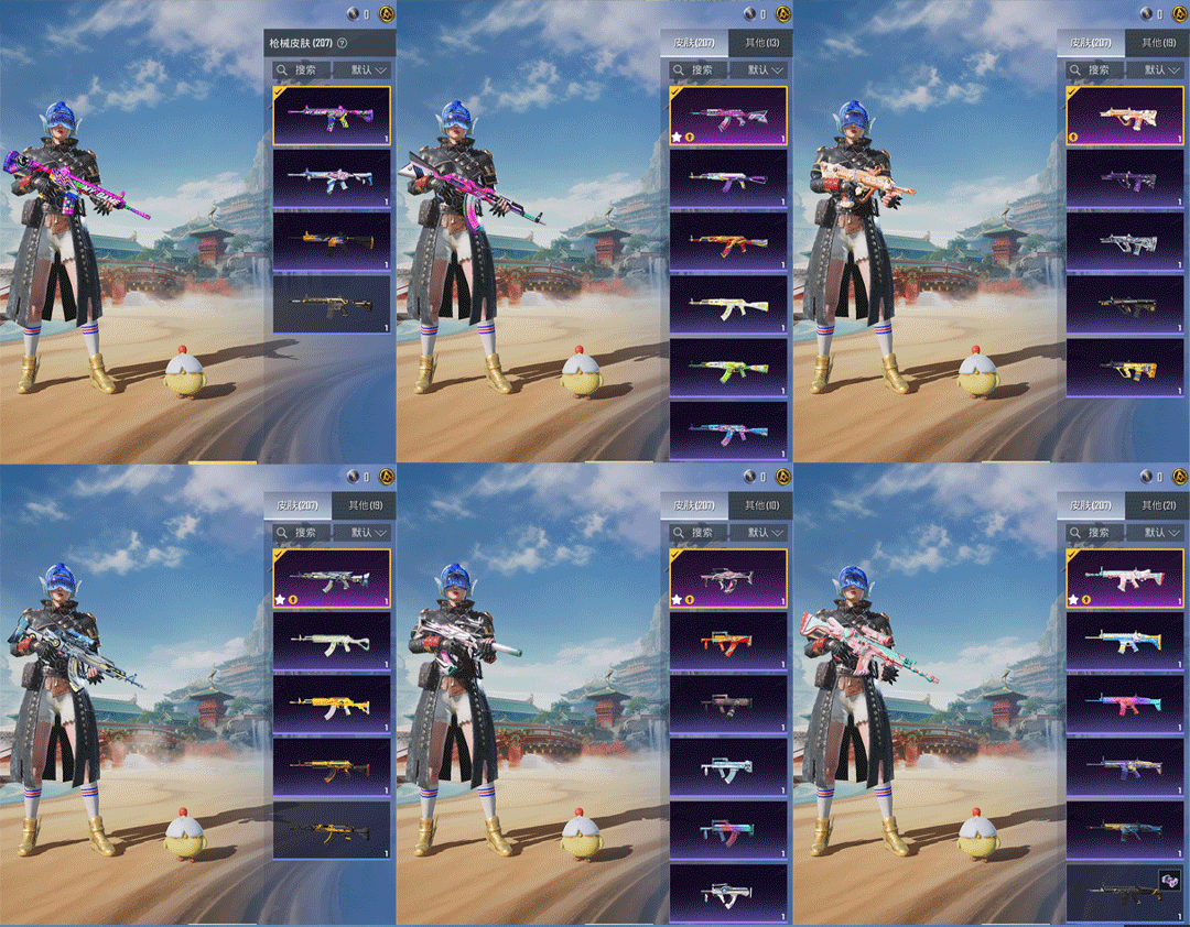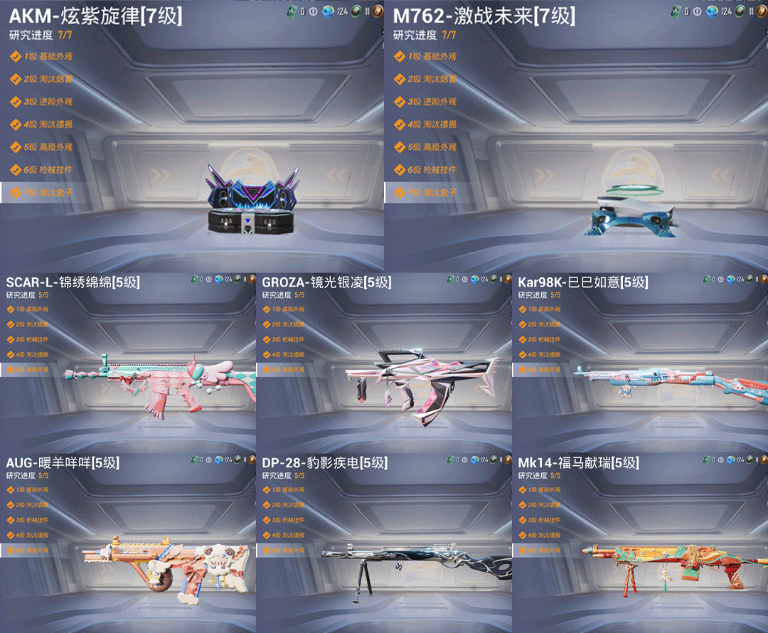 特效枪8:M762-激战未来/7级,,AKM-炫紫旋律/7级,Kar98K-巳巳如意/5级,,AUG-暖羊咩咩/5级,,Mk14-福马献瑞/5级,,SCAR-L-锦绣绵绵/5级,,GROZA-镜光银凌/5级,,DP-28-豹影疾电/5级,,