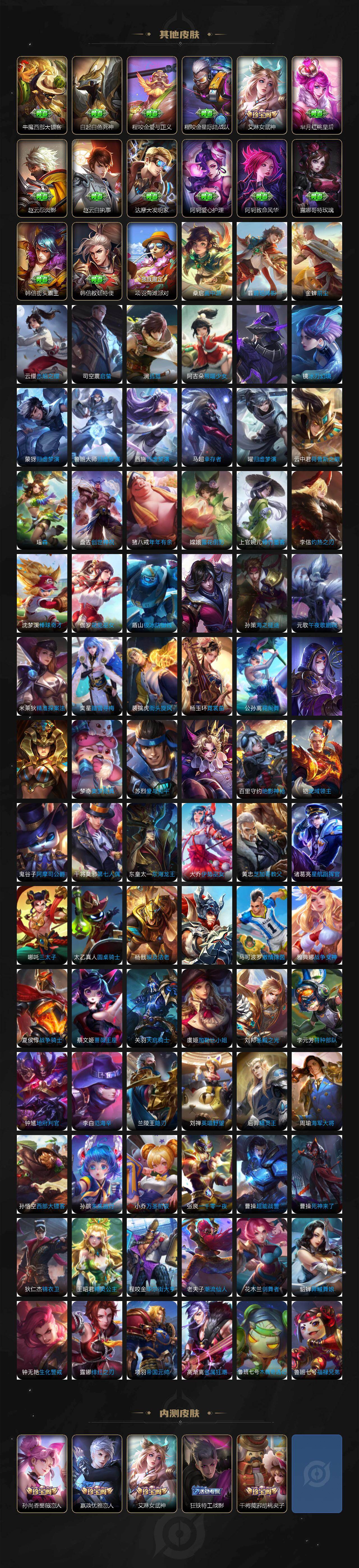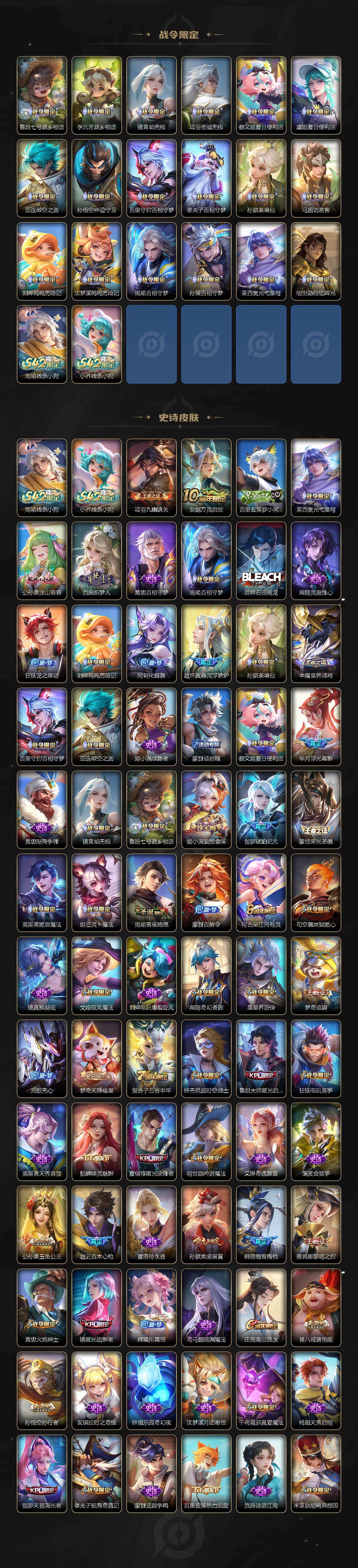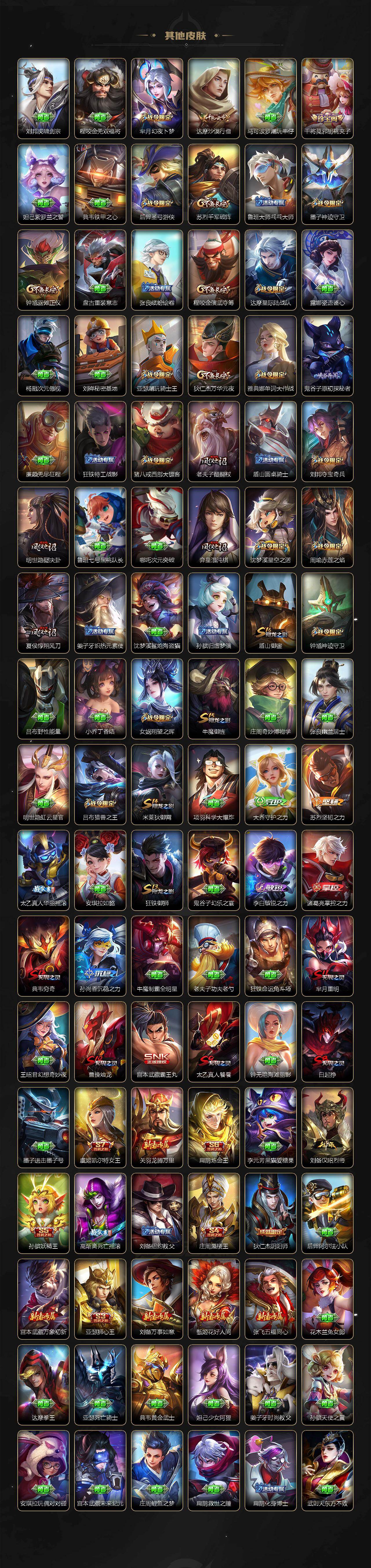 【英雄全皮】:刘禅全皮,扁鹊全皮,刘邦全皮,孙权全皮,娜可露露全皮,鬼谷子全皮,黄忠全皮,梦奇全皮,狂铁全皮,猪八戒全皮,敖隐全皮,蒙犽全皮,鲁班大师全皮,蒙恬全皮,戈娅全皮,空空儿全皮,影全皮