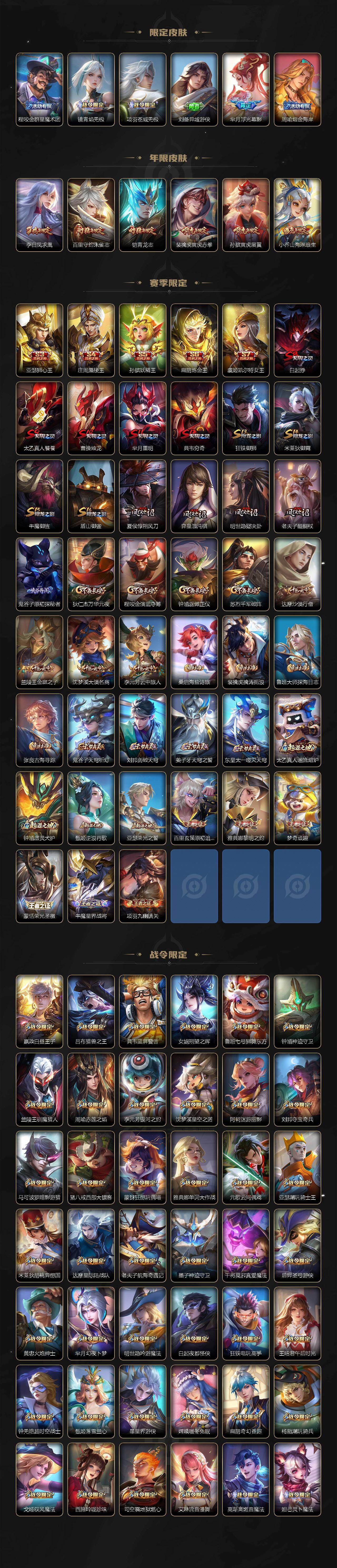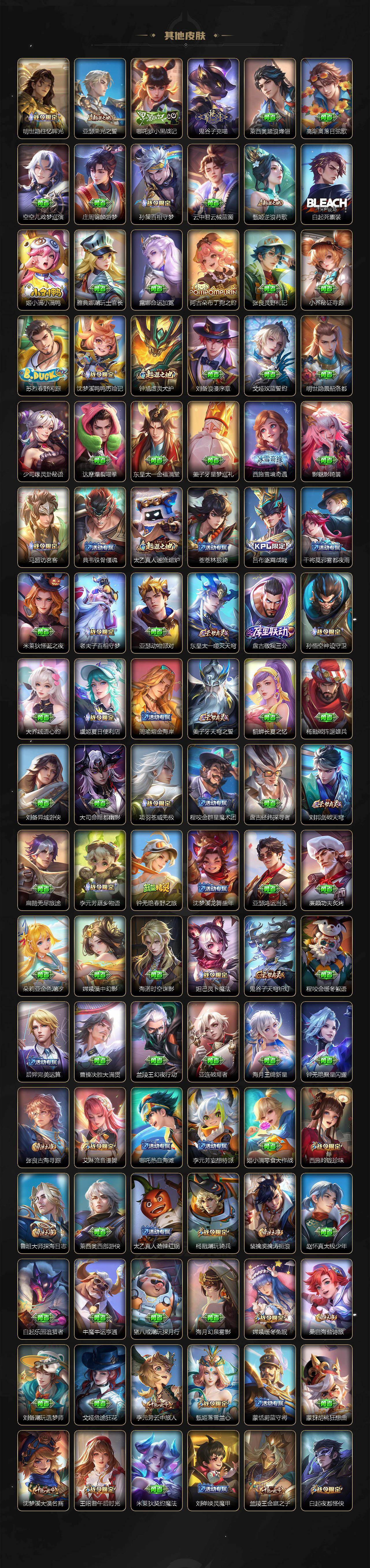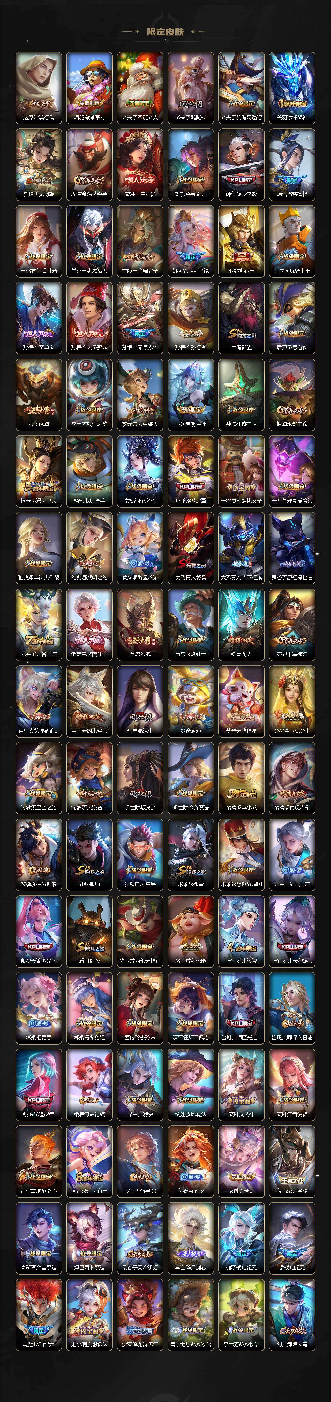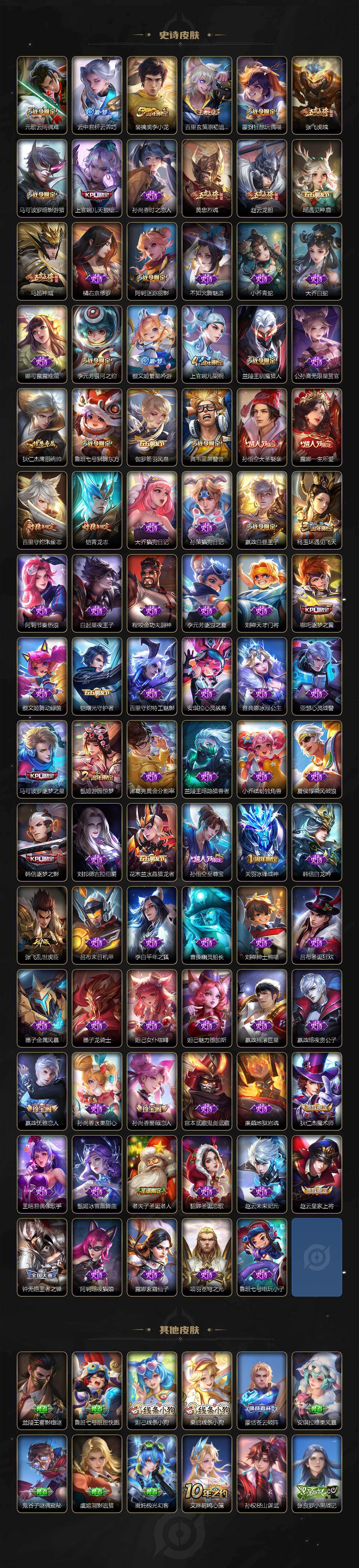 【英雄全皮】:刘禅全皮,扁鹊全皮,刘邦全皮,孙权全皮,娜可露露全皮,鬼谷子全皮,黄忠全皮,梦奇全皮,狂铁全皮,猪八戒全皮,敖隐全皮,蒙犽全皮,鲁班大师全皮,蒙恬全皮,戈娅全皮,空空儿全皮,影全皮