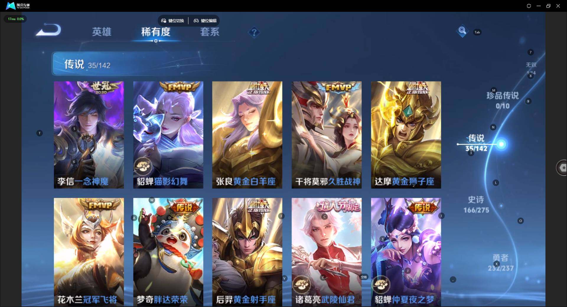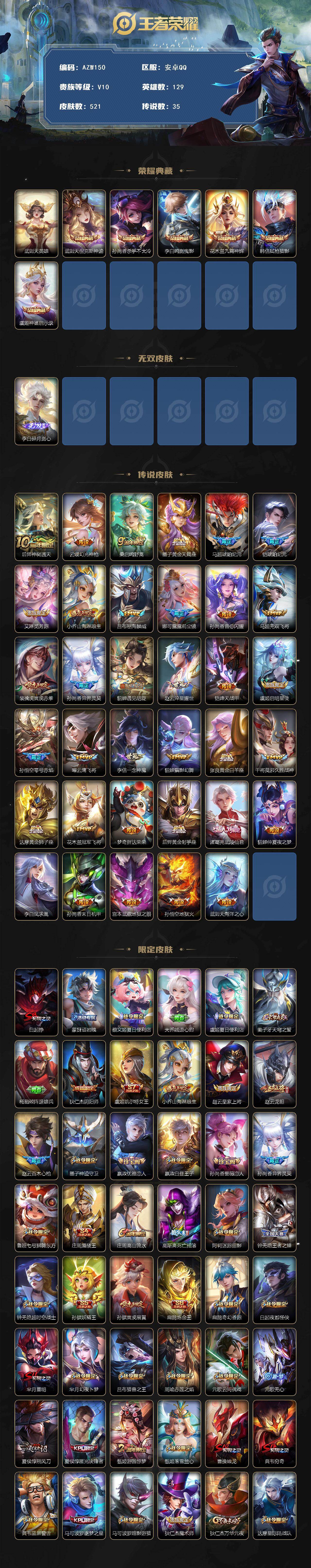【AZW150】安卓Q-V10-最强王者段位-129英雄-521皮肤-6典藏皮肤-1典藏英雄-1无双-35传说-165史诗