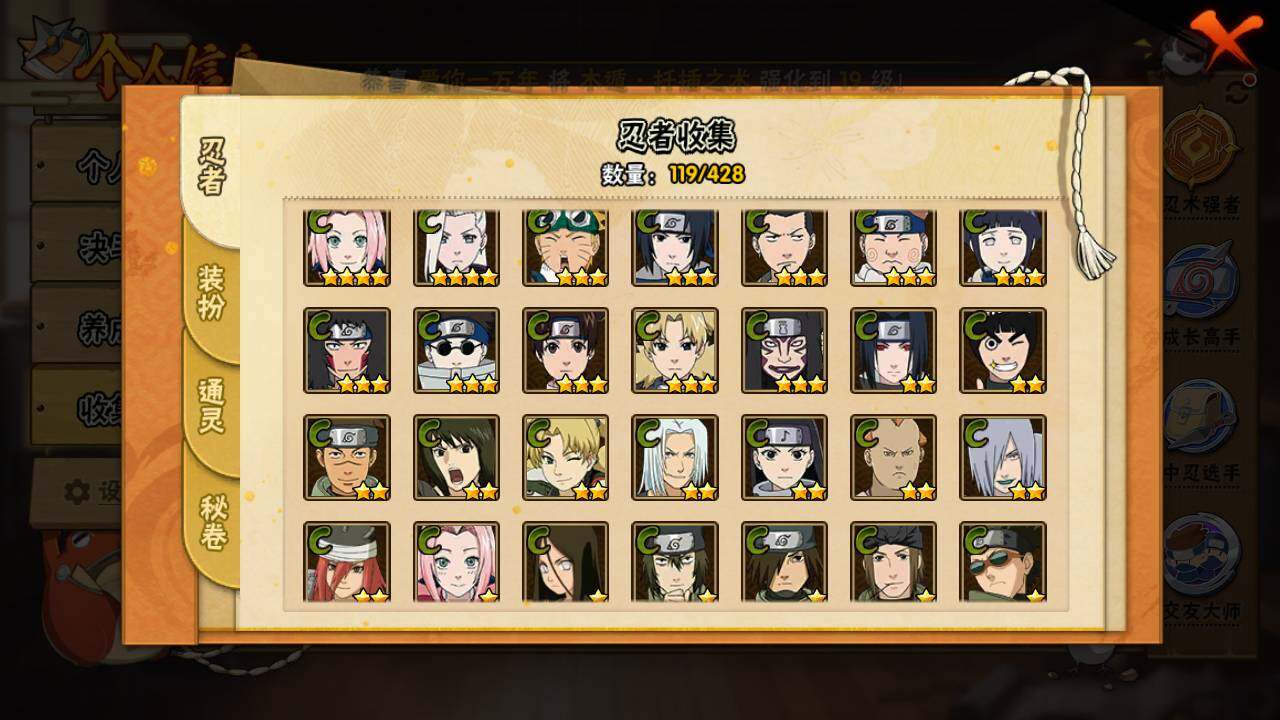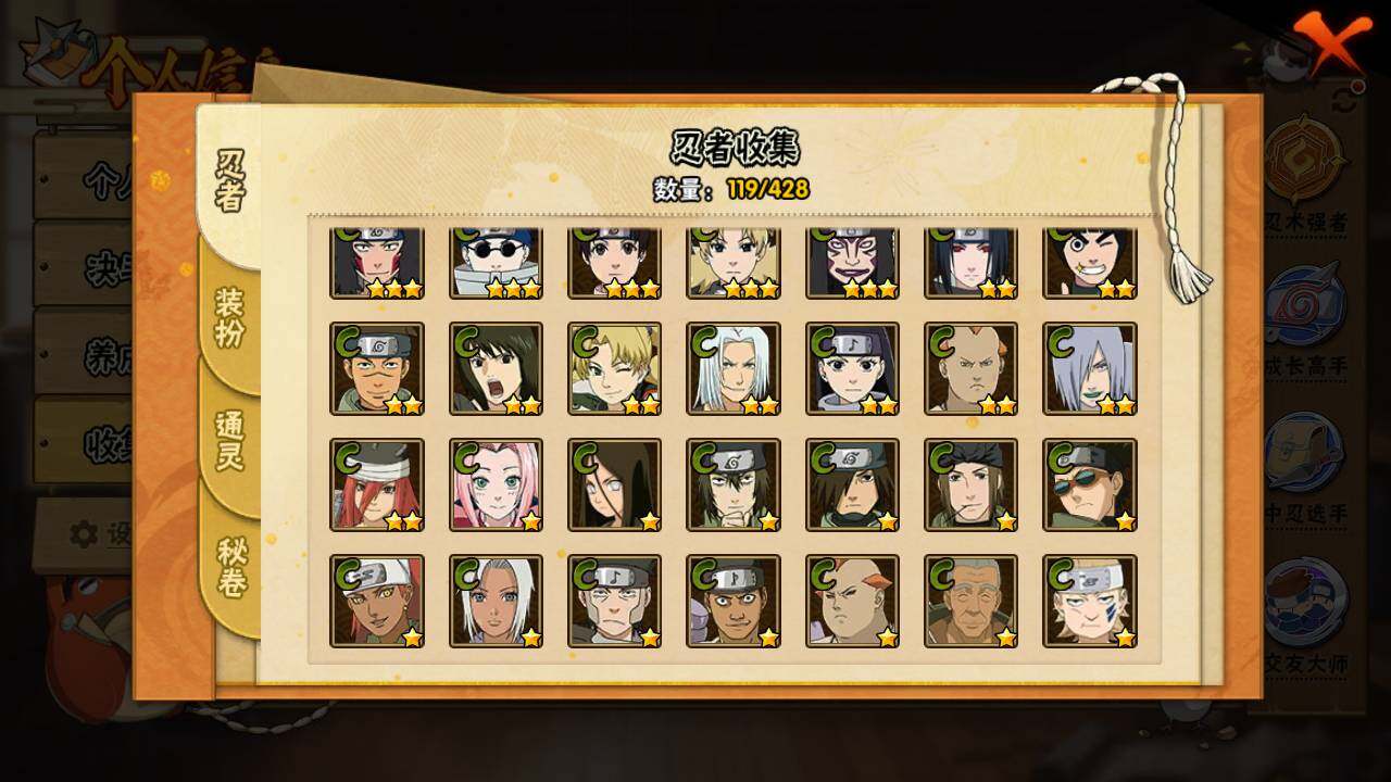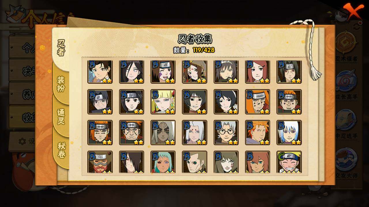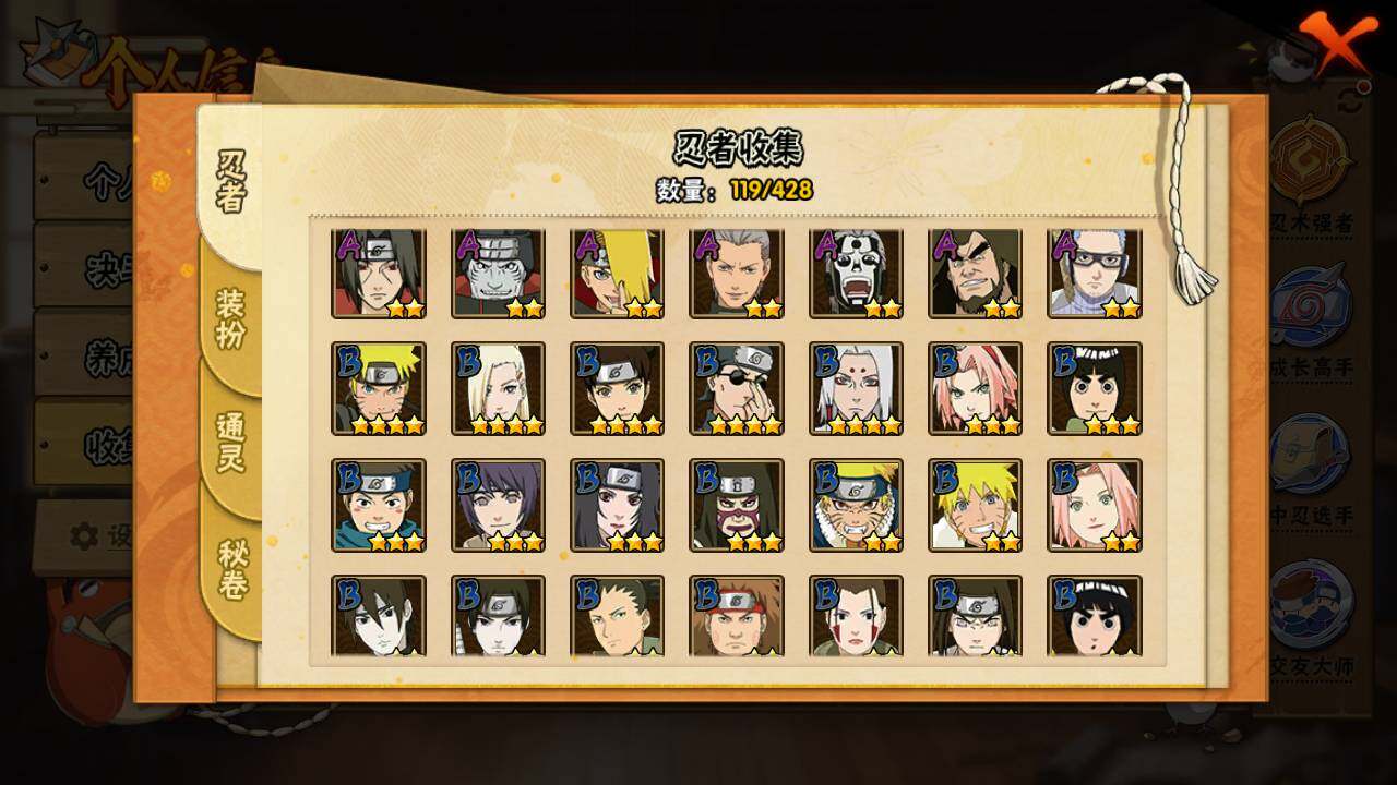 【S级忍者】:宇智波带土「忍界大战」(3星),宇智波鼬「须佐能乎」(3星),自来也「舞之豪杰」(3星),大蛇丸(3星),波风水门(3星),漩涡鸣人「九喇嘛连结」(3星),迈特凯「死门」(3星),佩恩「天道」(3星),宇智波佐助「永恒万花筒」(3星),宇智波斑 「白面具」(3星宇智波斑「白面具」),波风水门「九喇嘛连结」(3星),漩