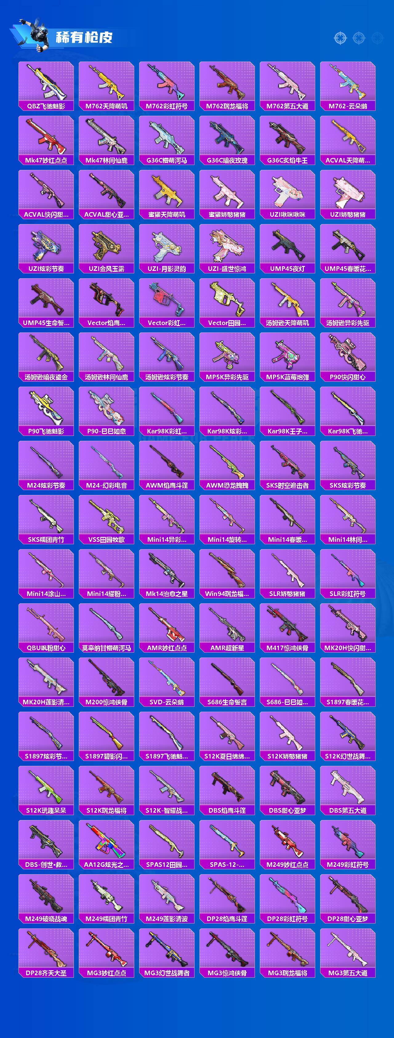 【粉色枪皮等级】:AKM-绿萝繁花(五级),SCAR-L-锦绣绵绵(五级),M416-风花雪月(七级),GROZA-镜光银凌(五级),Kar98K-巳巳如意(五级),M24-