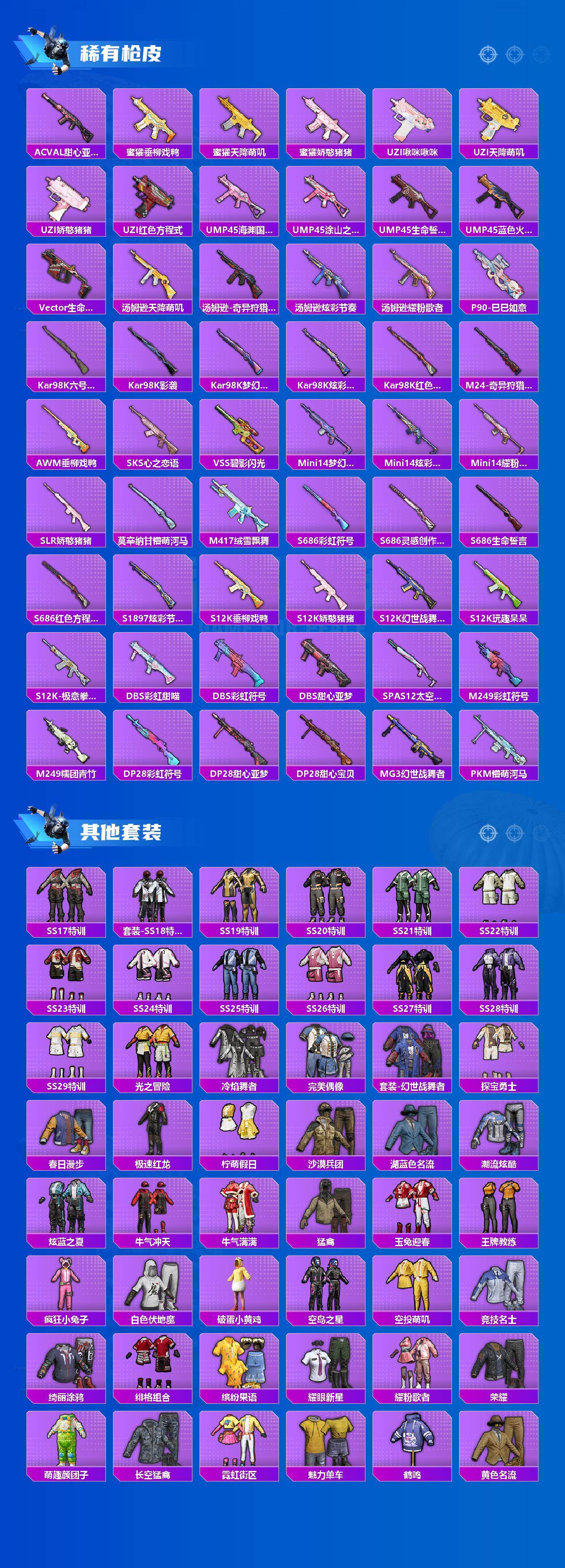 【粉色枪皮等级】:AKM-甜心宝贝(四级),M16A4-垂柳戏鸭(四级),M416-至情至圣(六级),ACE32-萌骑漫游(三级),Kar98K-巳巳如意