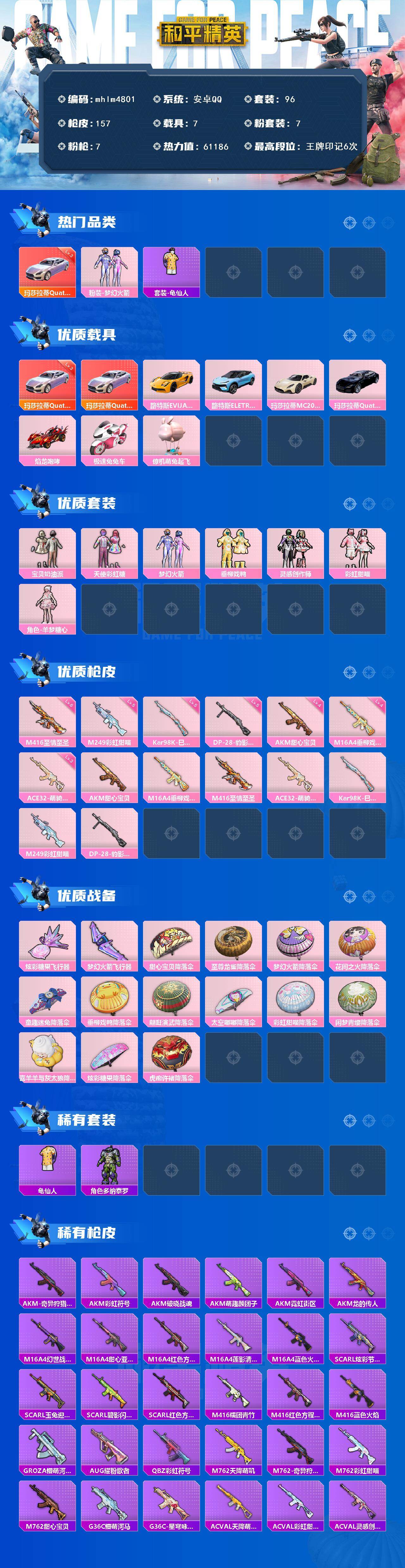 安卓 手Q-7粉装-7特效枪-7载具-2粉色飞行器-61186热力值-6王牌印记-96套装-157枪皮
