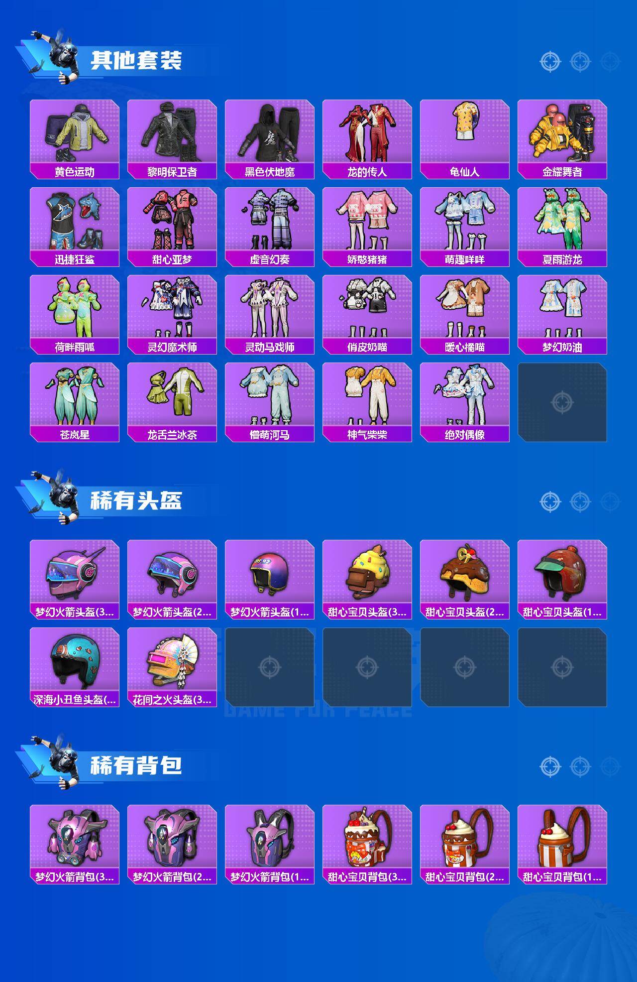 【粉色套装】:粉装-宝贝奶油派,粉装-天使彩虹糖,粉装-梦幻火箭,粉装-垂柳戏鸭,粉装-灵感创作师,粉装-彩虹甜喵,角色-羊梦糖心