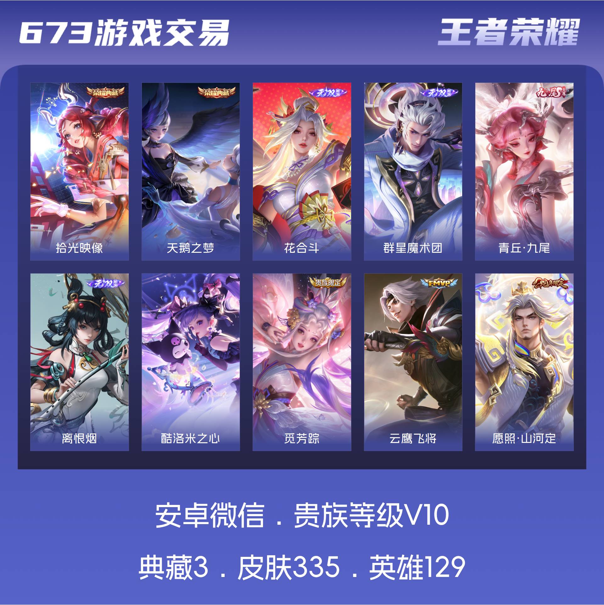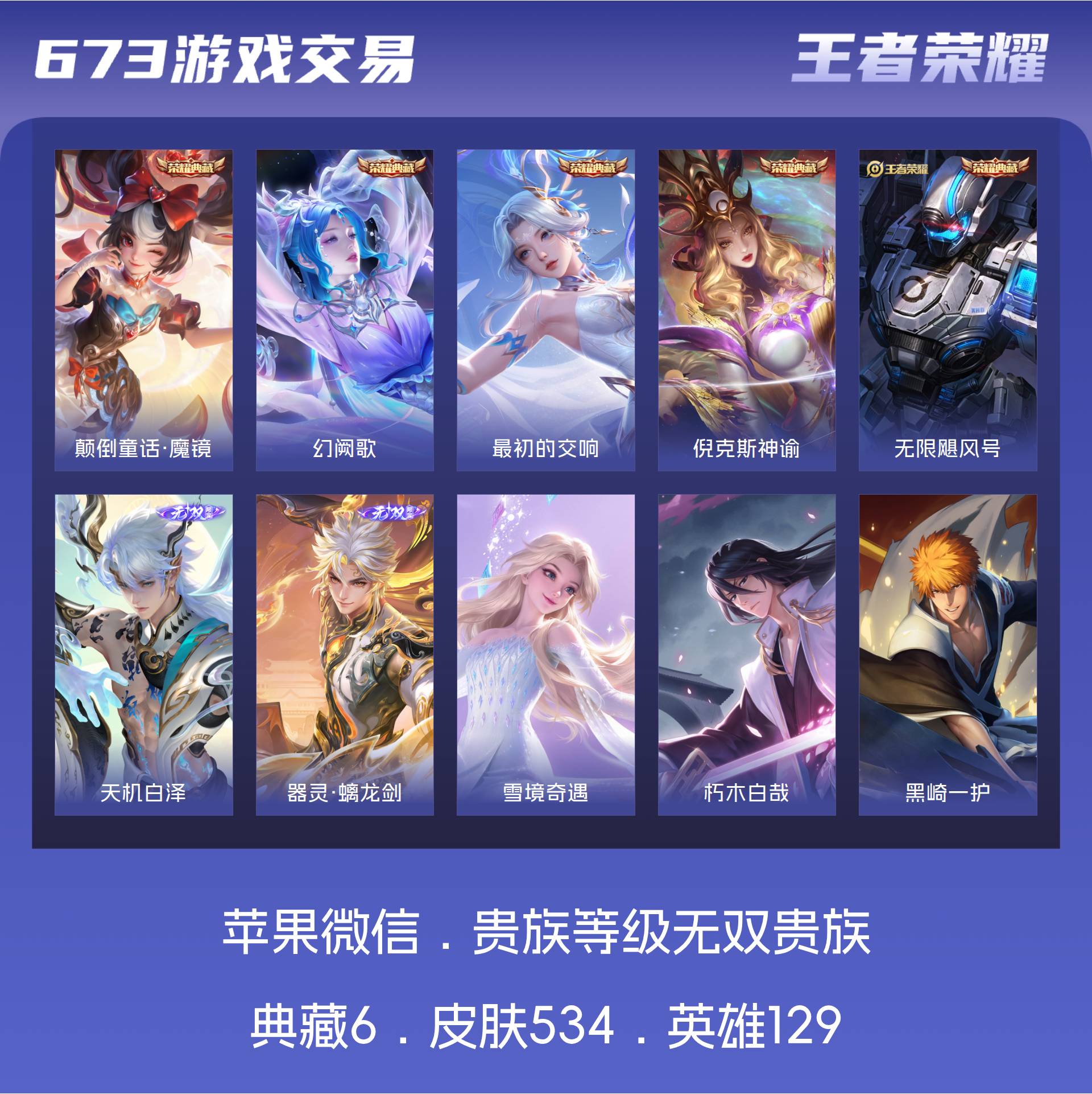 【秒换绑】苹果Q-V11-最强王者段位-128英雄-442皮肤-2典藏皮肤-1珍品无双-9无双-10珍品传说-67传说-129史诗