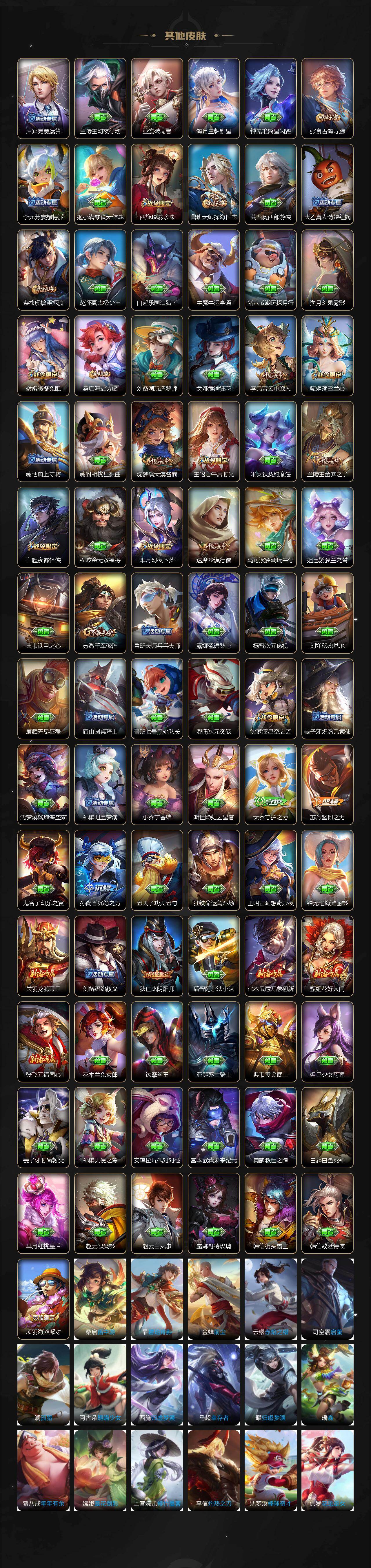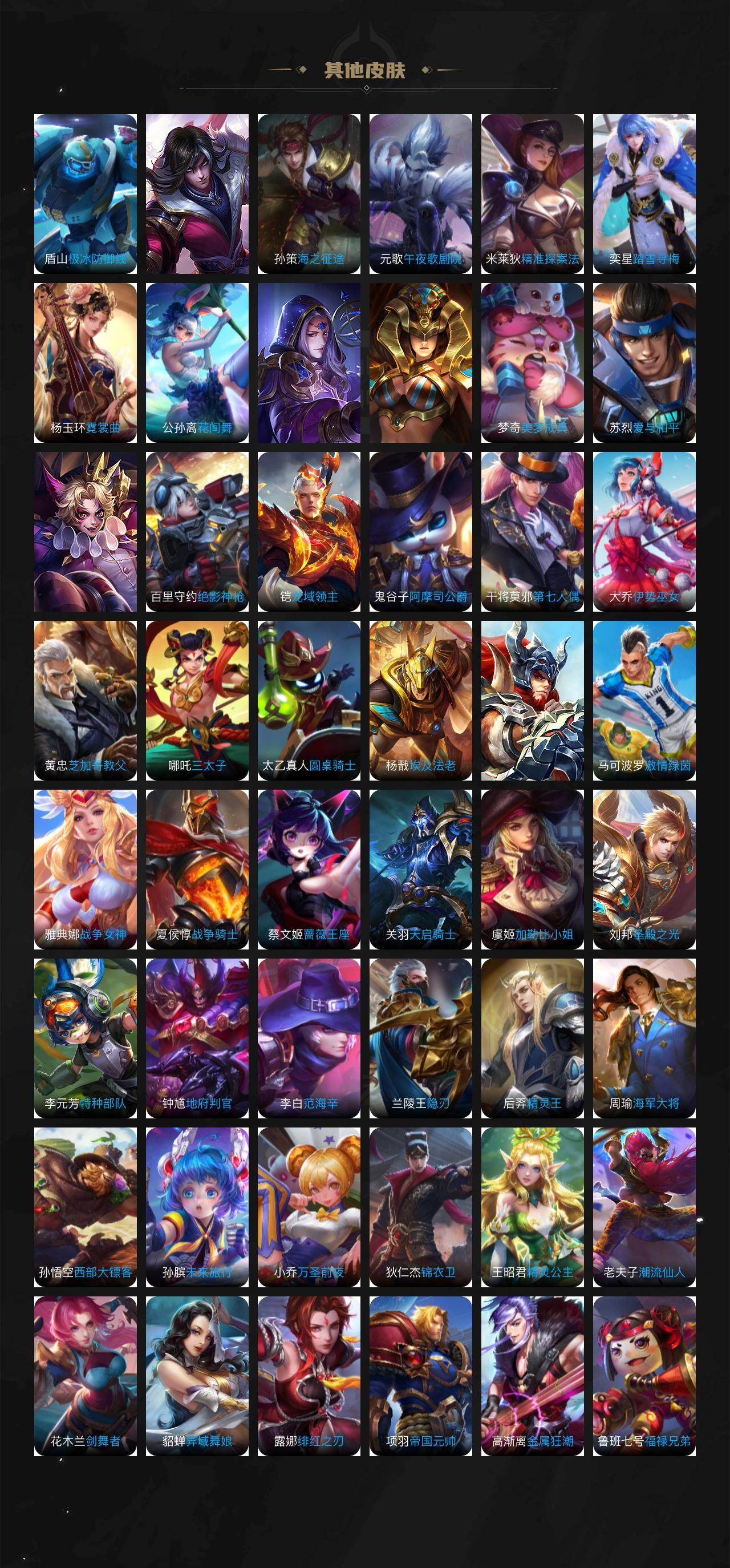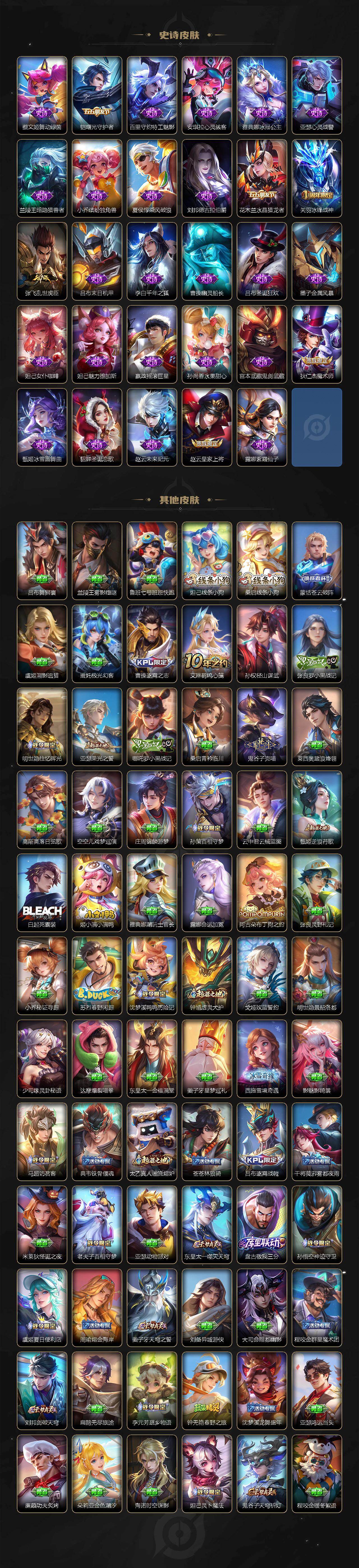 【英雄全皮】:孙权全皮,朵莉亚全皮,苍全皮,沈梦溪全皮,瑶全皮,敖隐全皮,海月全皮,澜全皮,阿古朵全皮,桑启全皮,夏洛特全皮,金蝉全皮,暃全皮,空空儿全皮,影全皮,姬小满全皮
