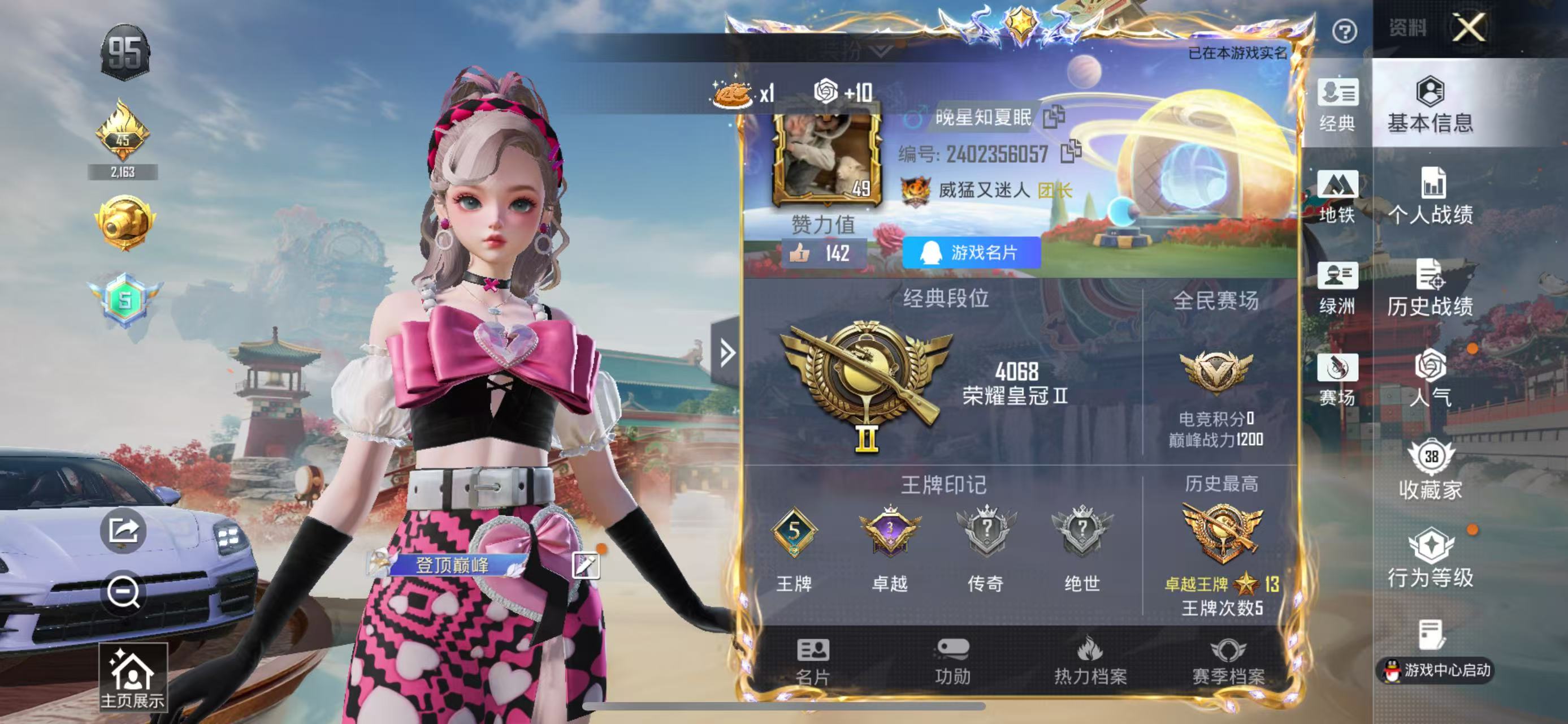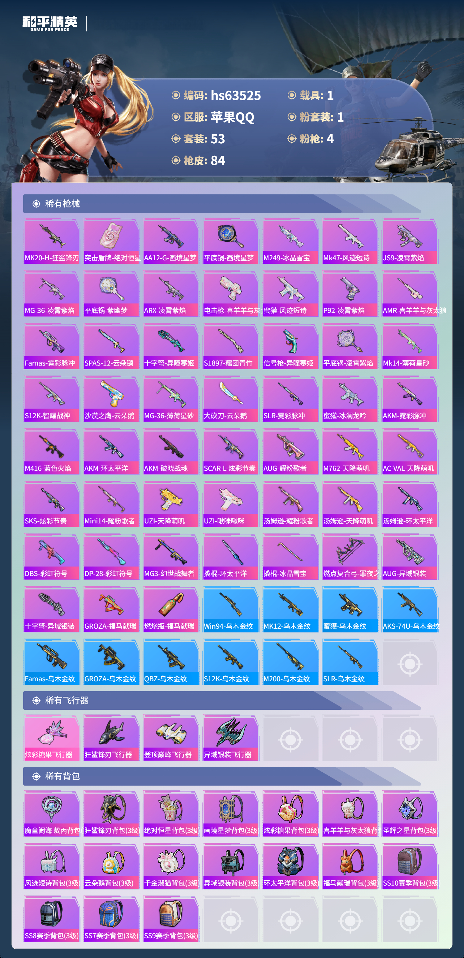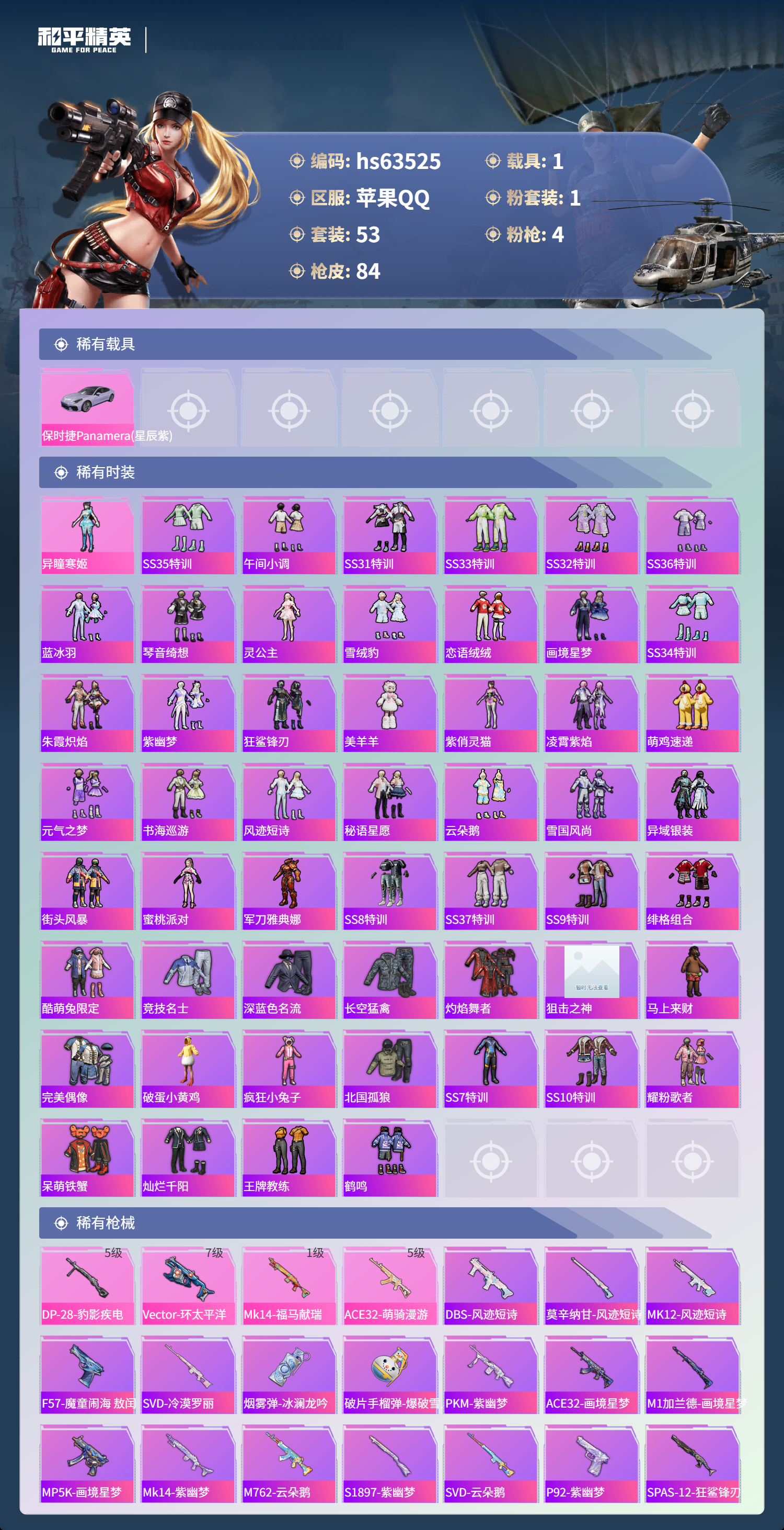 hs63525 苹果手Q-5王牌印记-1粉装-4特效枪-1载具-24719热力值-53套装-84枪皮-3卓越印记