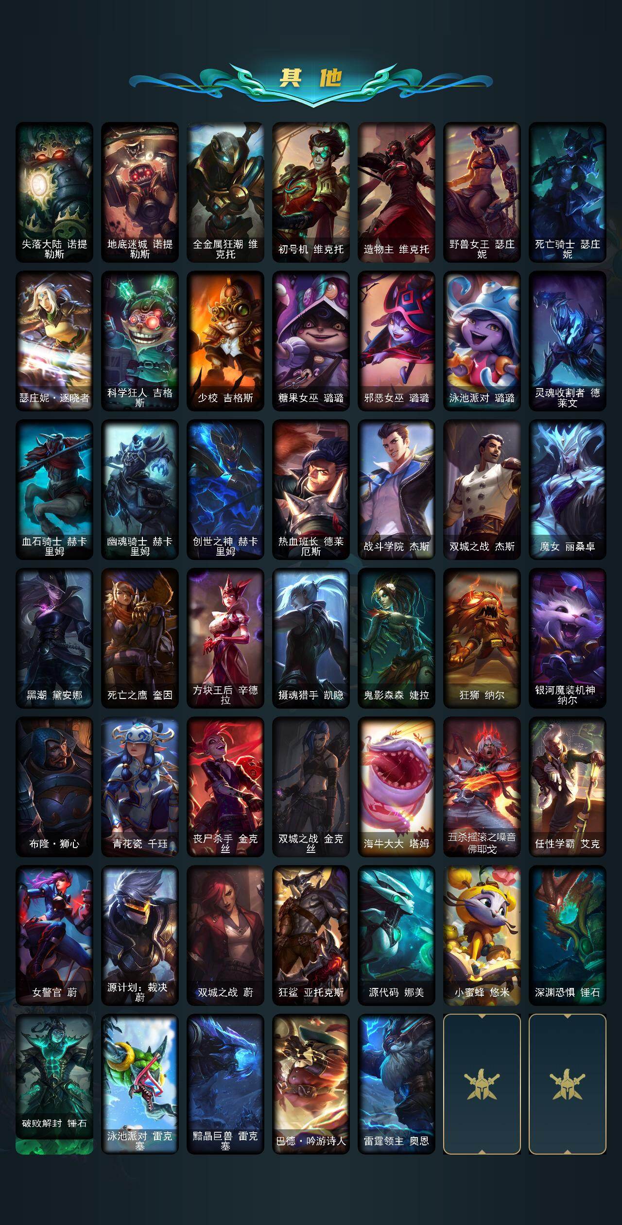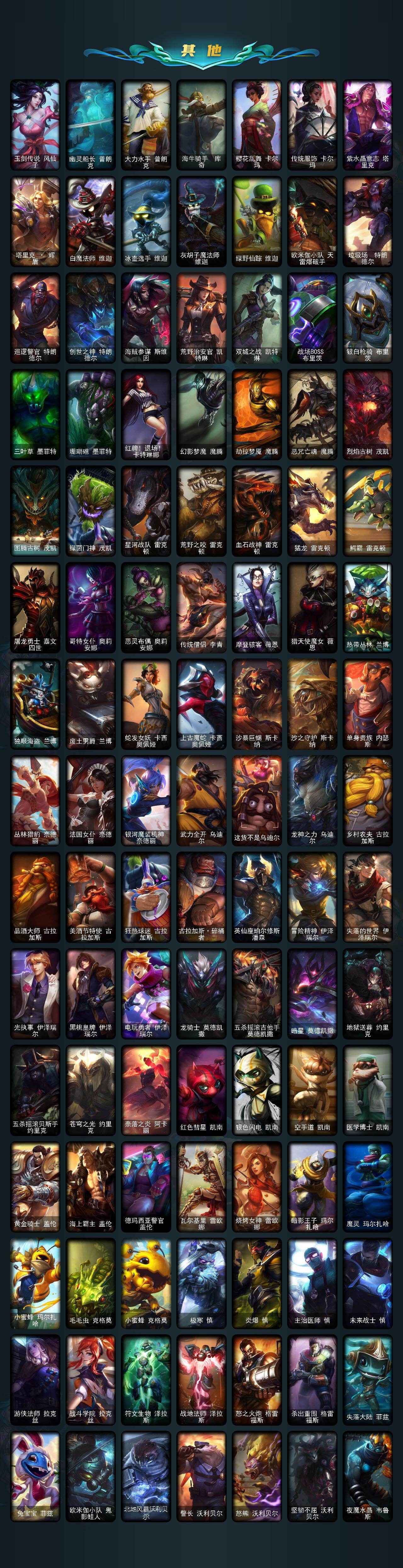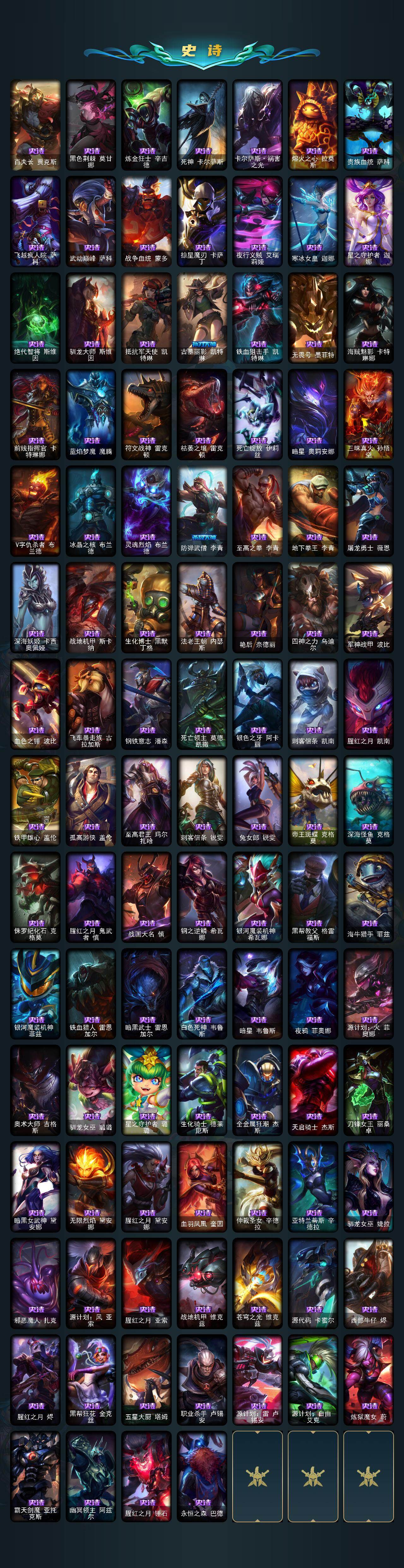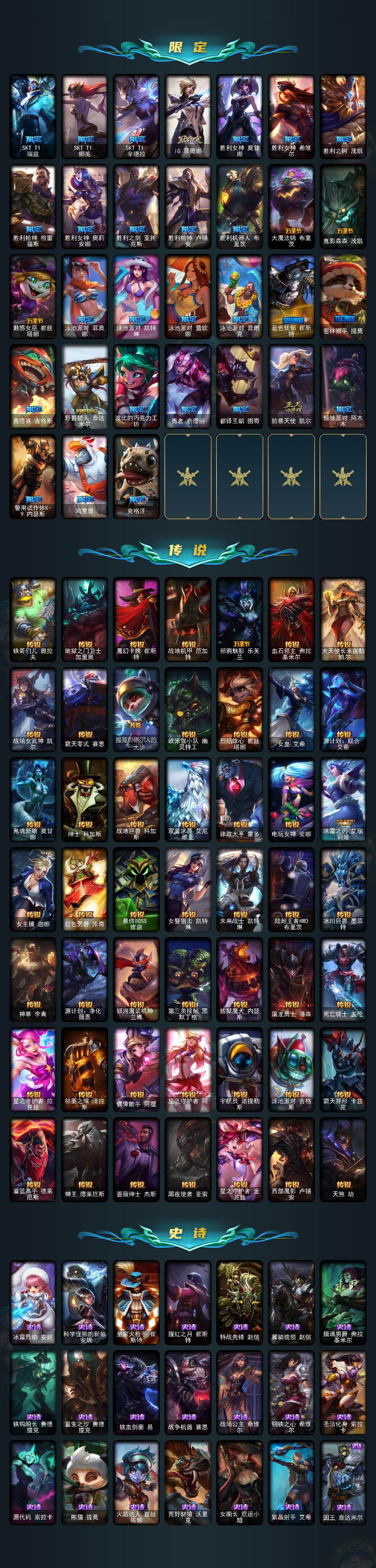 【神话皮肤】:十周年纪念安妮,源代码乐芙兰,神凰行者瑞羽圣凰艾尼维亚,海克斯科技阿利斯塔,海克斯科技嘉文四世,海克斯科技雷克顿,零之枪骑赫卡里姆,摄魂使者薇恩,新创战纪希维尔,至臻征服者贾克斯,至臻电玩女神凯特琳,至臻电玩女神凯特琳2022,至臻黑夜使者李青,至臻黑夜使者李青2022,至臻KDA阿卡丽,至臻KDA阿卡丽2022,至臻KDAALLOUT卡莎,至臻灵能特工伊泽瑞尔,至臻绒毛菲兹,至臻绒毛