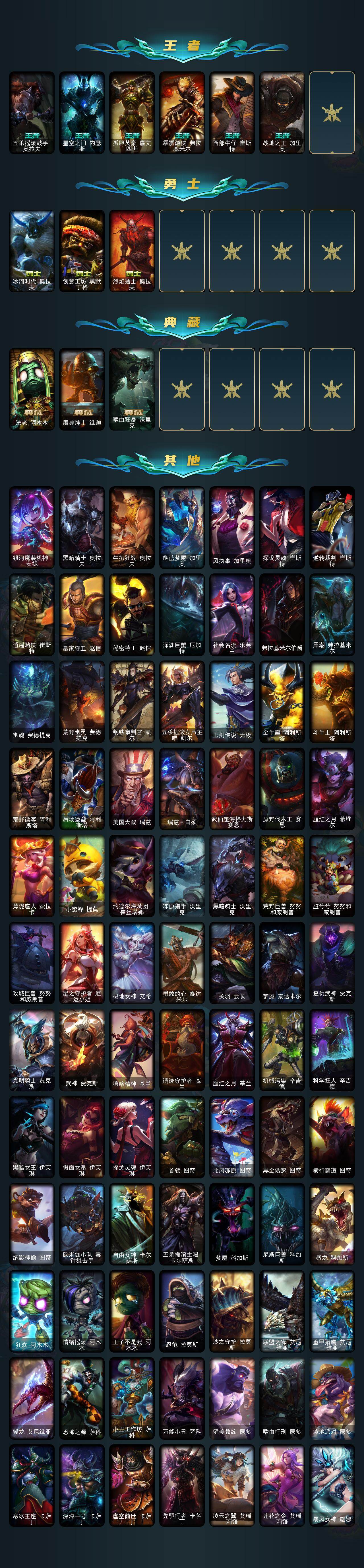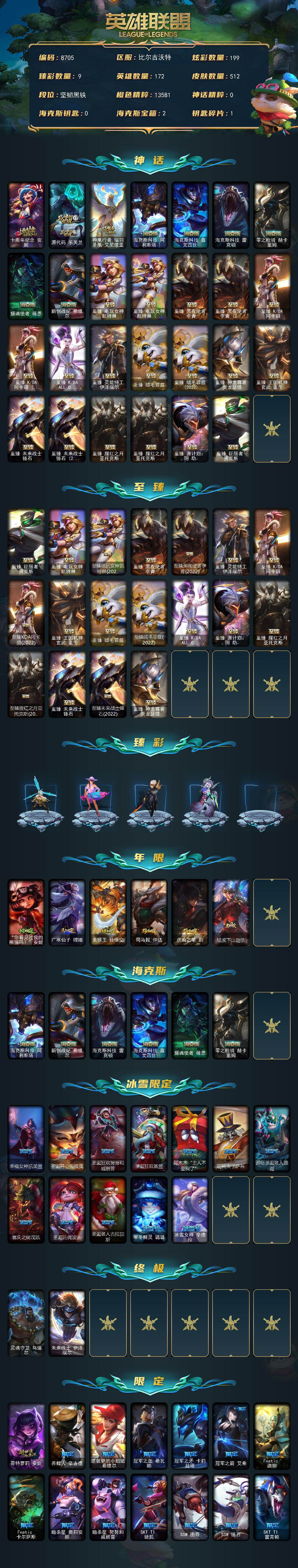 未定级段位-172英雄-512皮肤-199炫彩-2终极-27神话-63限定-49传说-123史诗