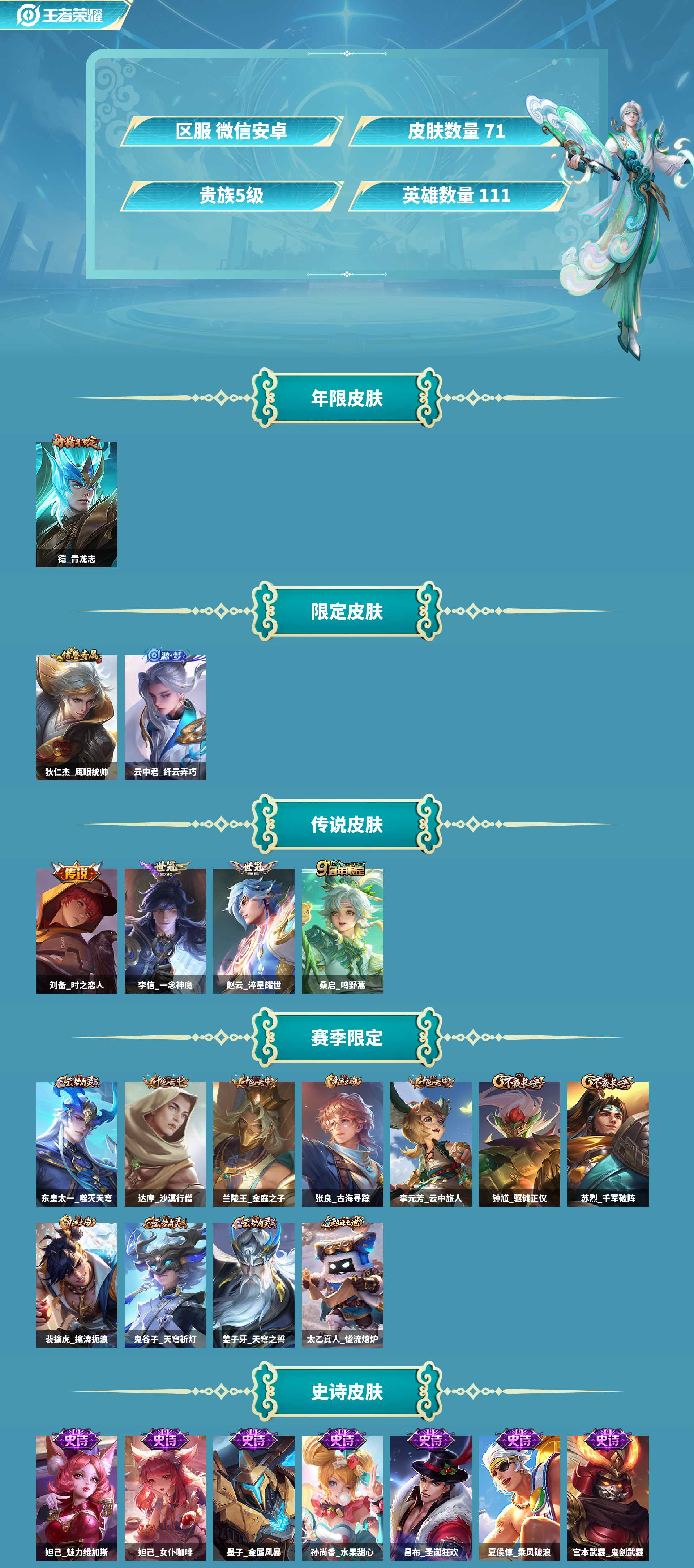 老号微信,一切正常皮肤数71传说皮肤数4史诗皮肤数16英雄数