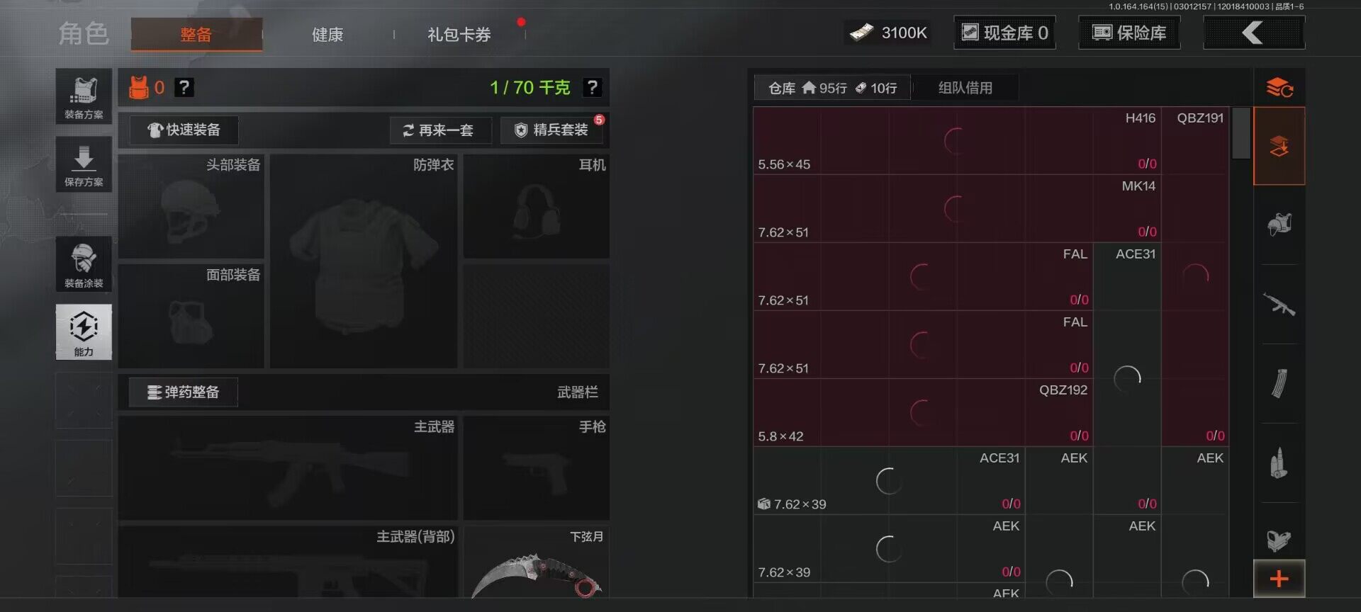 等级:30/段位:暗区传说/仓库价值(百万):11.8/柯恩币:3100000/下弦月/幽燕钛玄/冥河/深潜行者II/清影