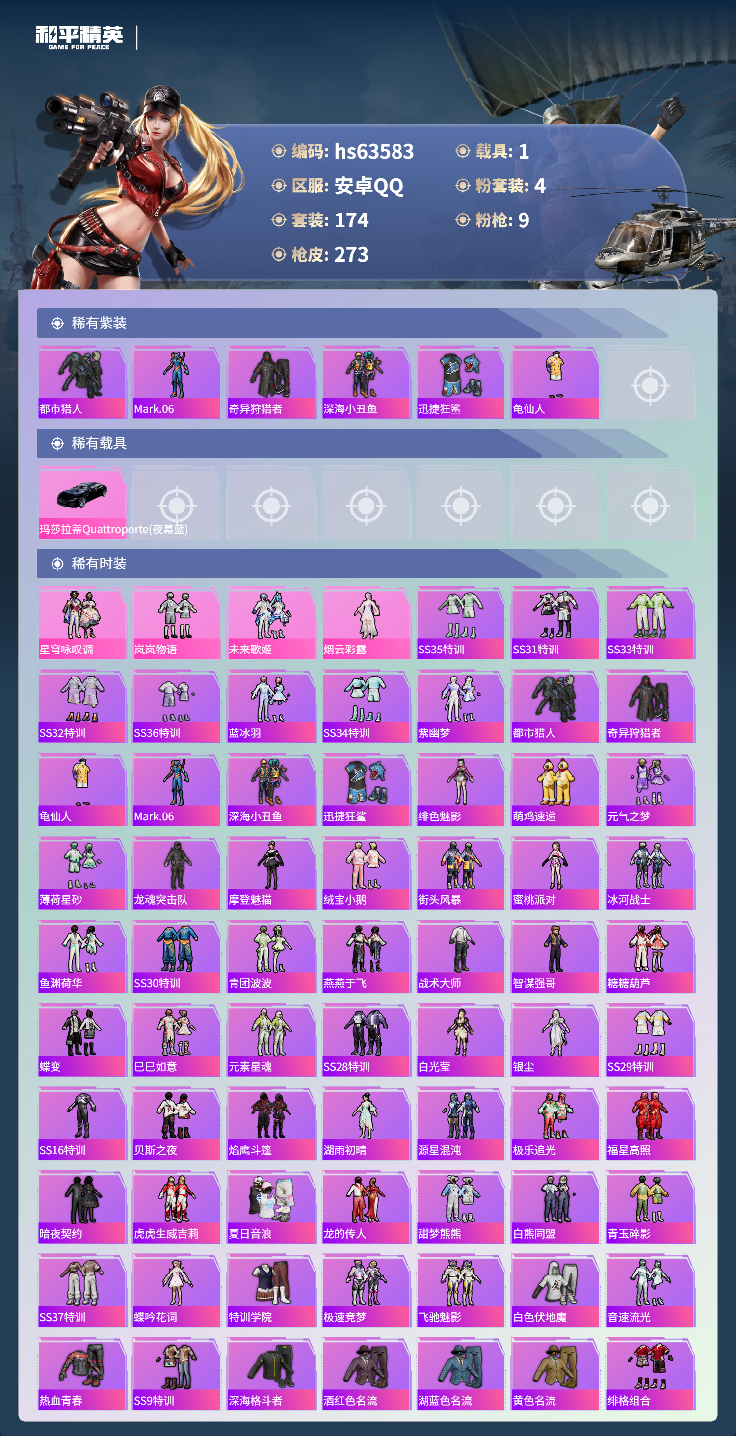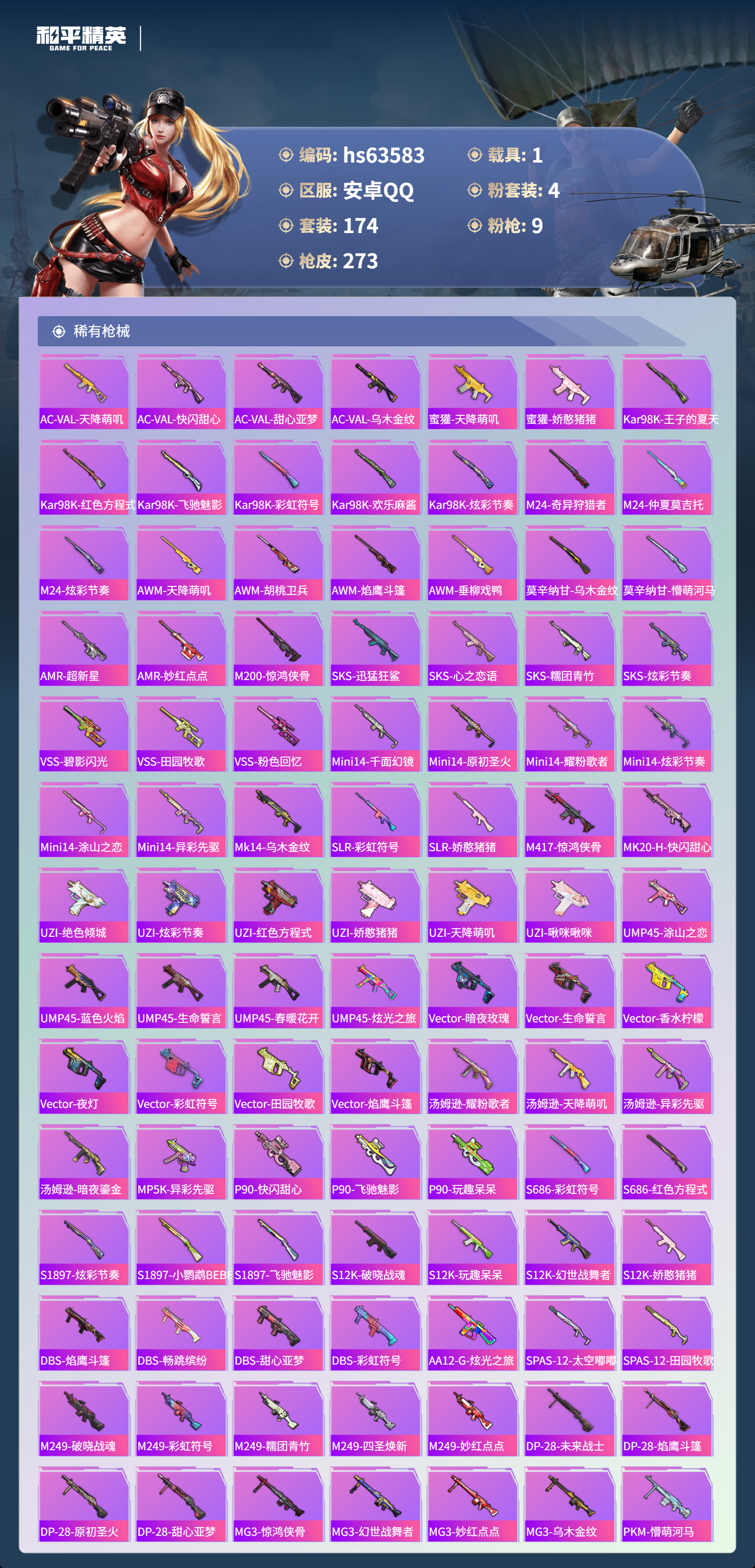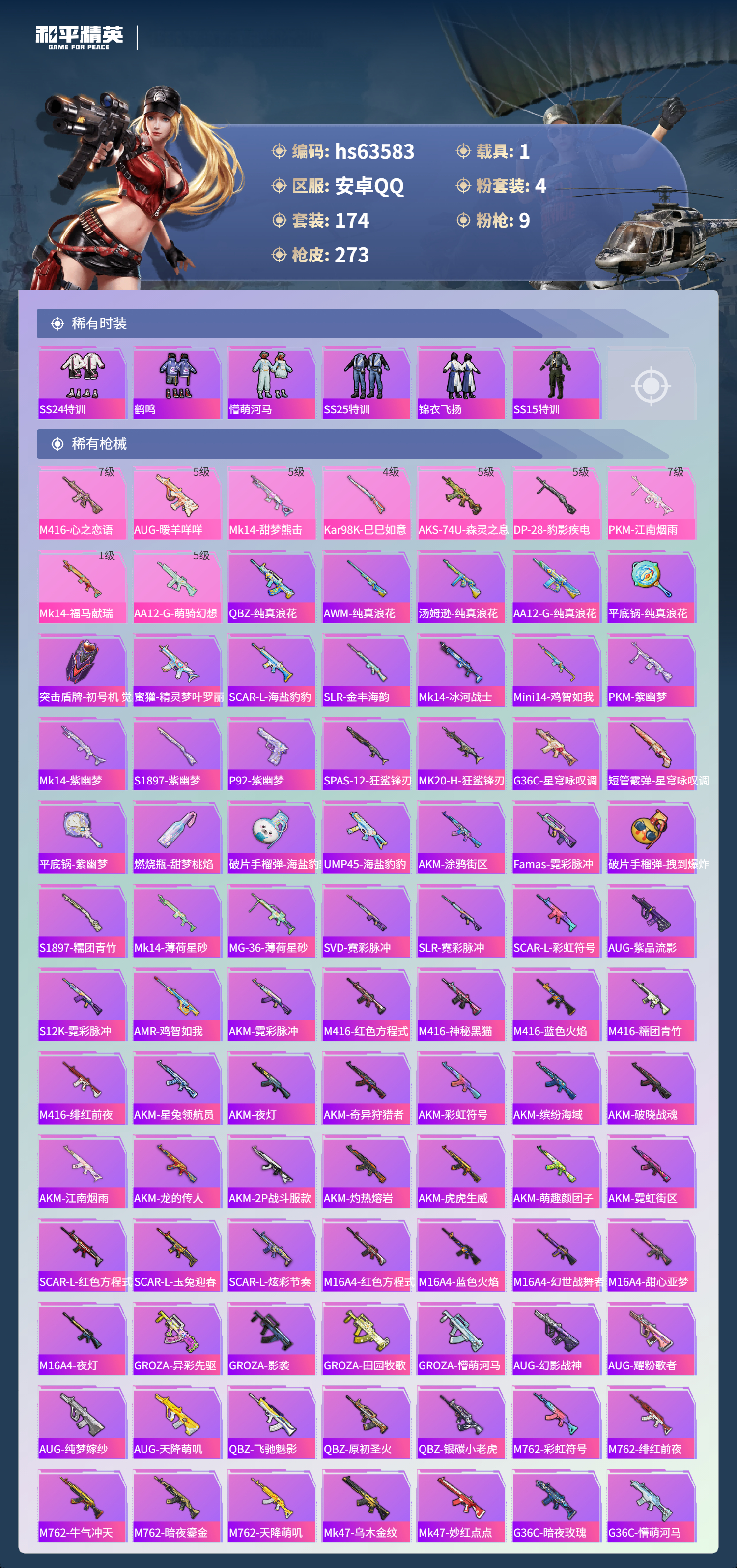 hs63583 安卓手Q-14王牌印记-4粉装-9特效枪-1载具-77440热力值-174套装-273枪皮-1卓越印记