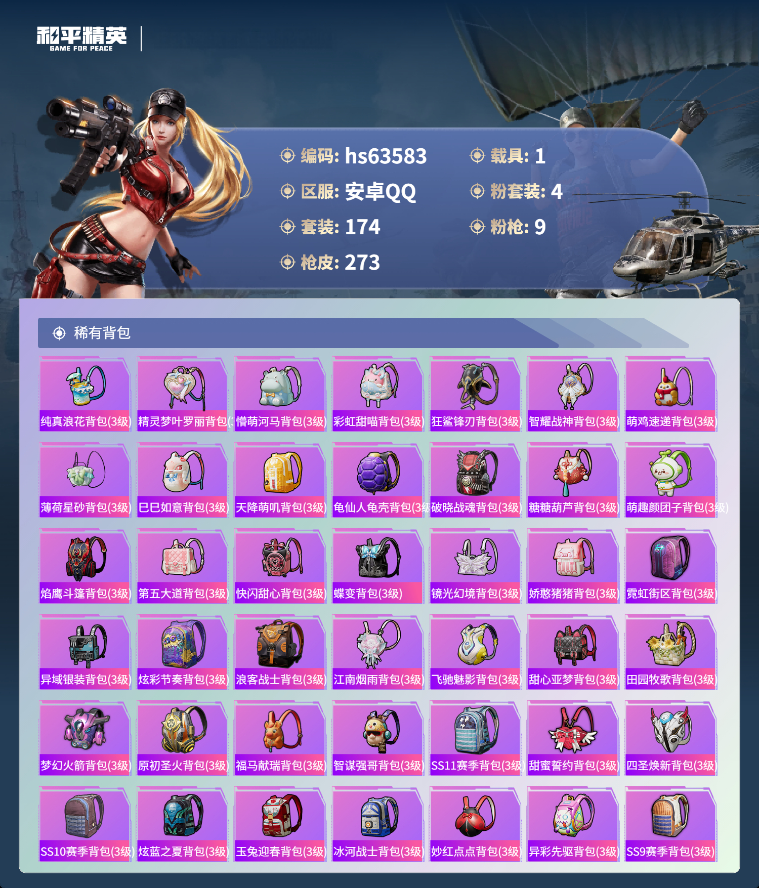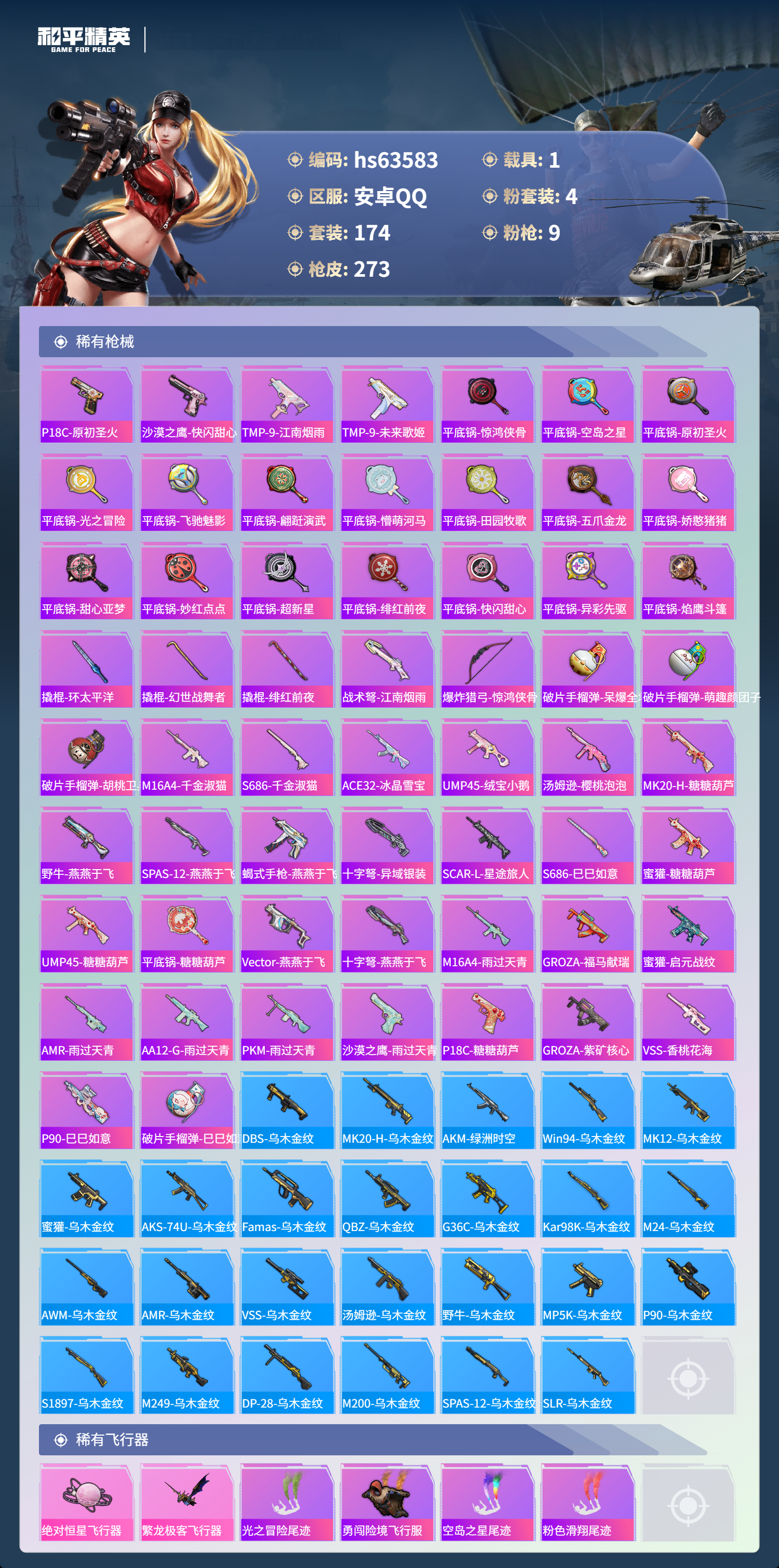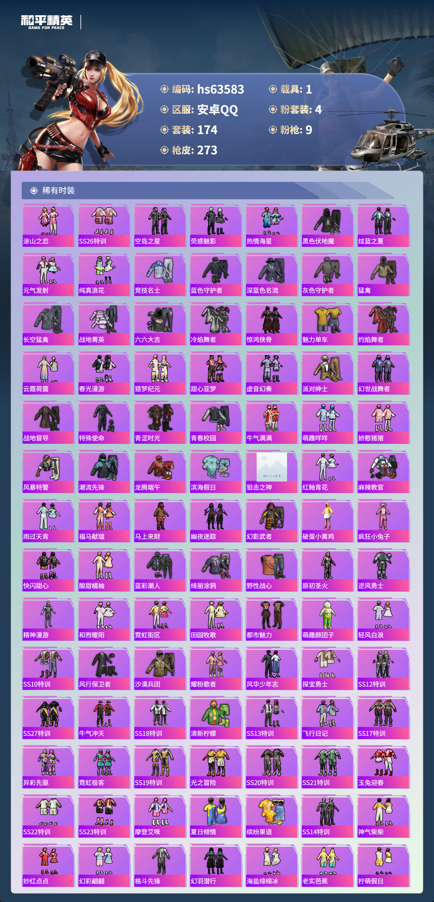 hs63583 安卓手Q-14王牌印记-4粉装-9特效枪-1载具-77440热力值-174套装-273枪皮-1卓越印记
