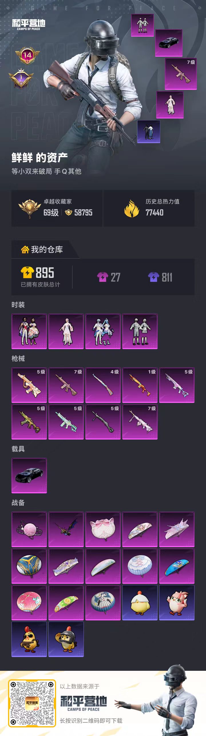 14王牌印记-4粉装-9特效枪-1载具-77440热力值-174套装-273枪皮-1卓越印记