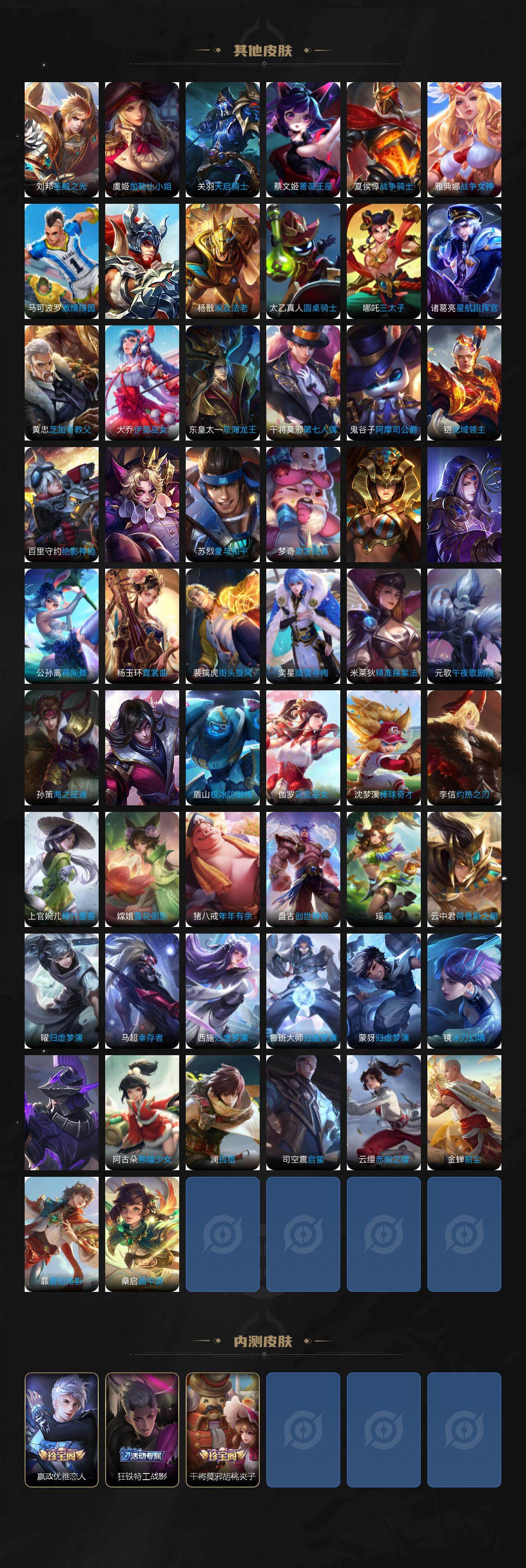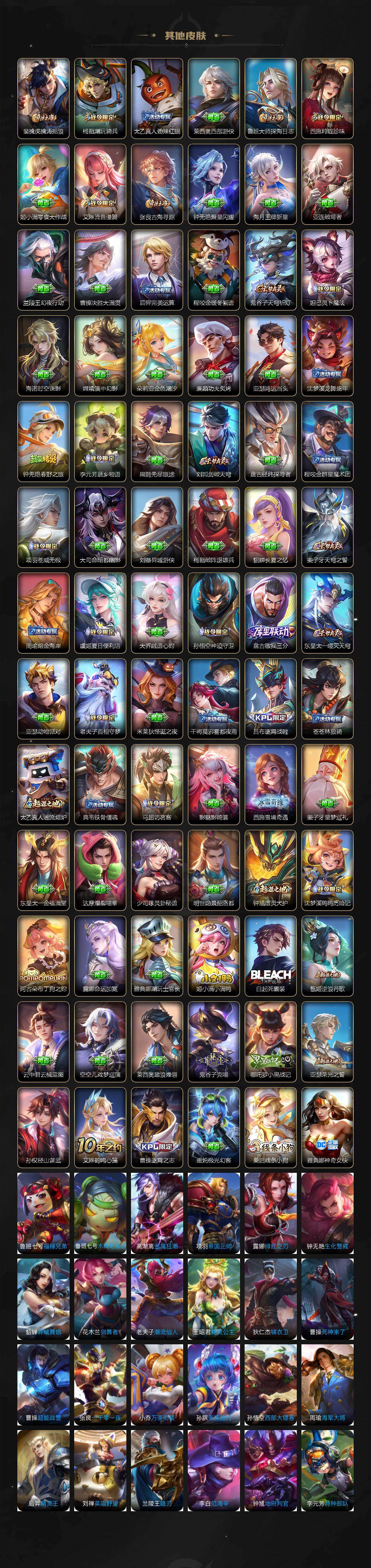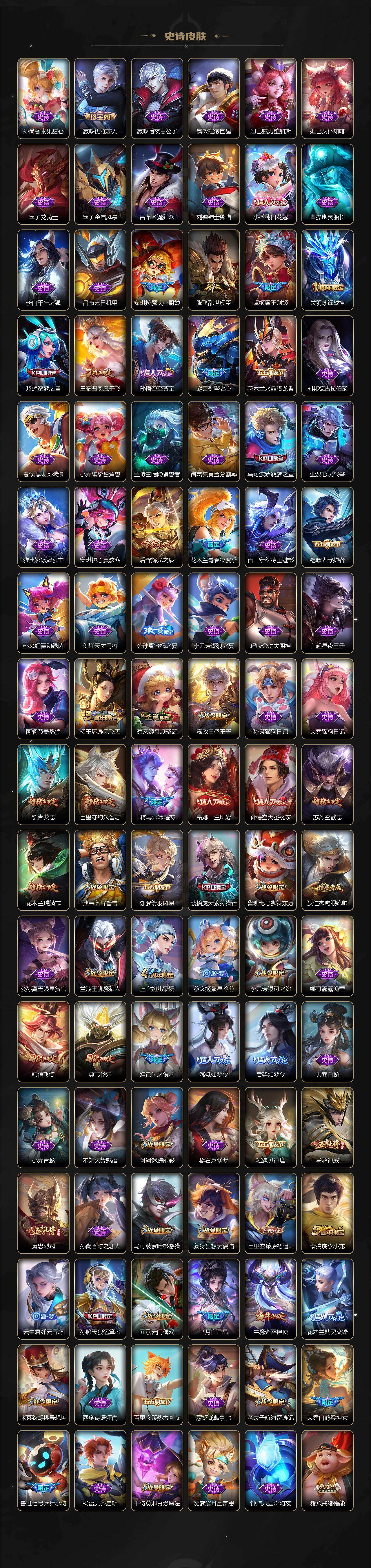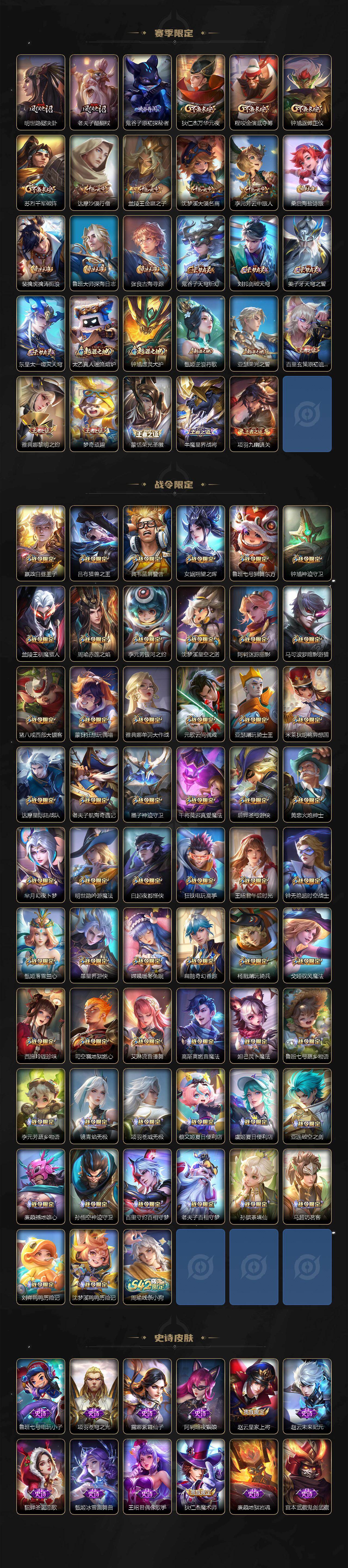 【英雄全皮】:嬴政全皮,阿轲全皮,李白全皮,马可波罗全皮,达摩全皮,司马懿全皮,露娜全皮,孙权全皮,娜可露露全皮,苍全皮,雅典娜全皮,大乔全皮,沈梦溪全皮,瑶