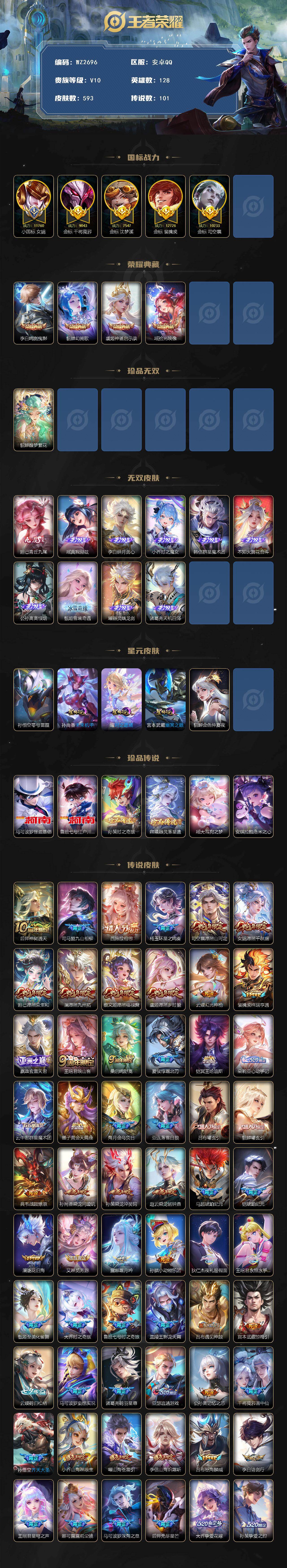 【秒换绑】安卓Q-V10-【1.1w小国标女娲】【1.2w金标裴擒虎,司空震,干将莫邪,沈梦溪】至尊星耀III段位-128英雄-593皮肤-4典藏皮肤-1珍品无双-10无双-6珍品传说-101传说-198史诗