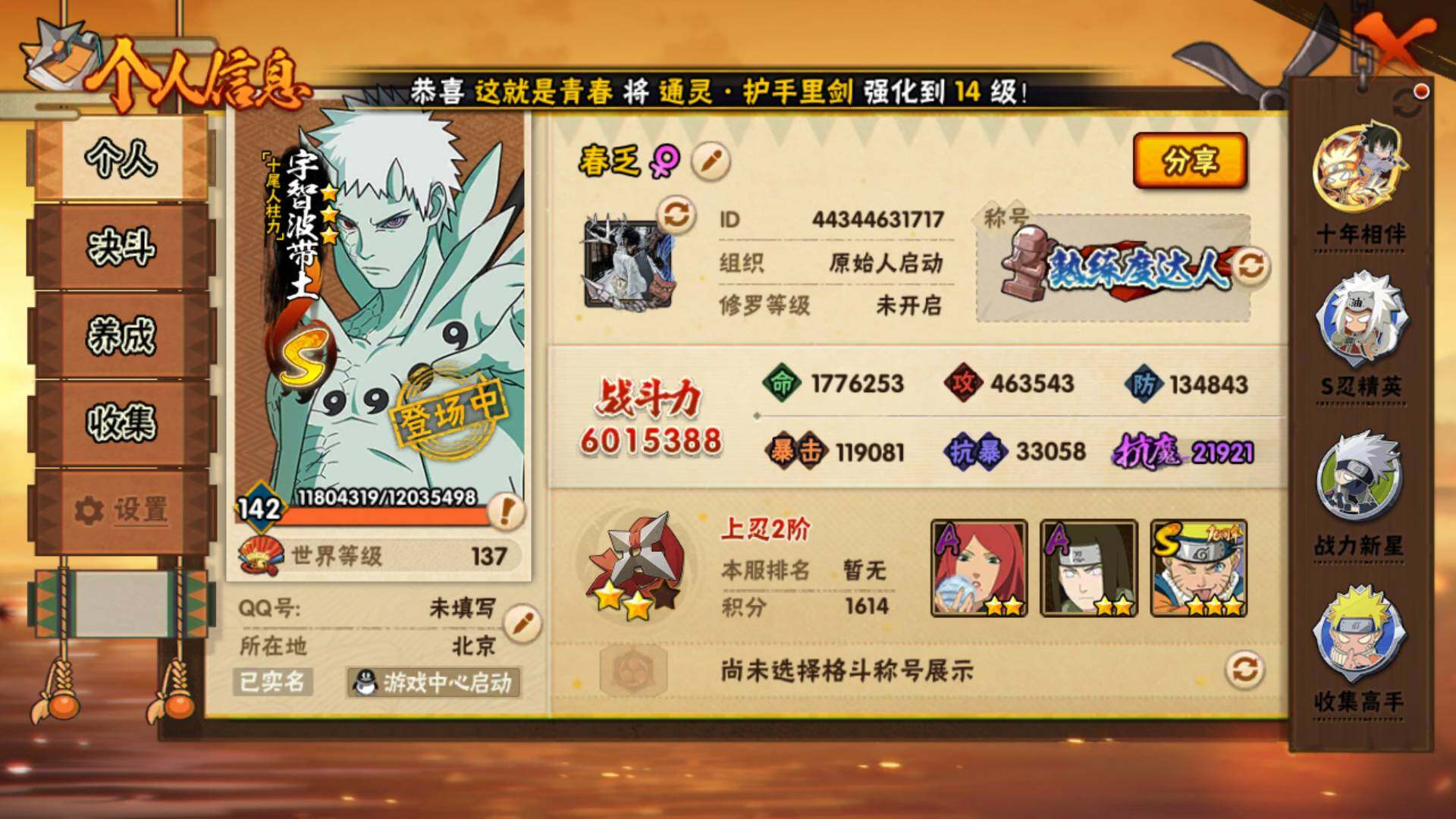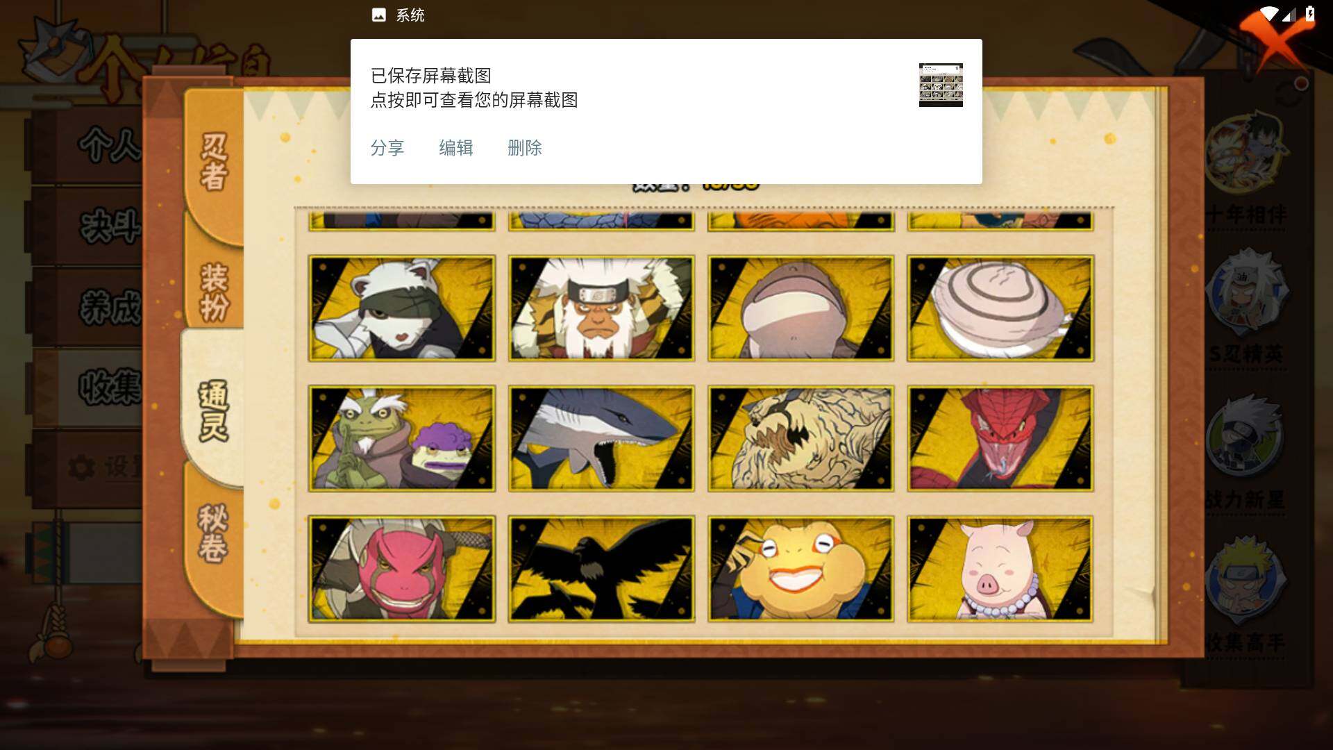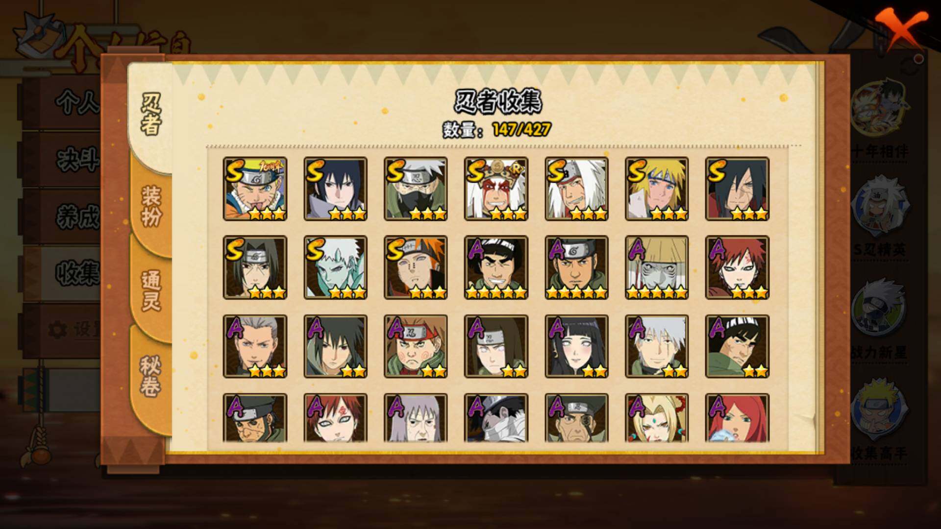 【S级忍者】:宇智波斑「秽土转生·解」(3星),宇智波鼬「须佐能乎」(3星),旗木卡卡西「须佐能乎」(3星),自来也「舞之豪杰」(3星),自来也「传说中的三忍」(3星),波风水门(3星),佩恩「天道」(3星),宇智波佐助「永恒万花筒」(3星),漩涡鸣人·宇智波佐助(3星),宇智波带土「十尾人柱力」(3星)
