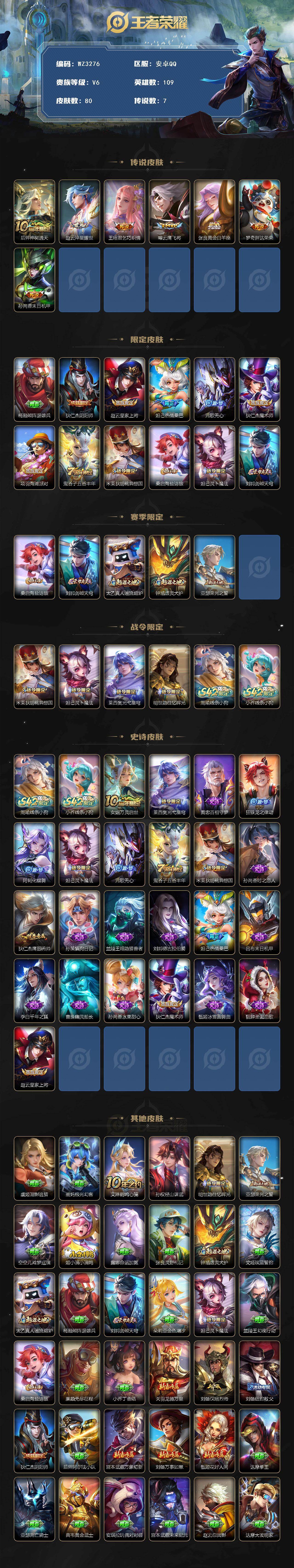 【秒换绑】安卓Q-V6-永恒钻石II段位-109英雄-80皮肤-7传说-23史诗