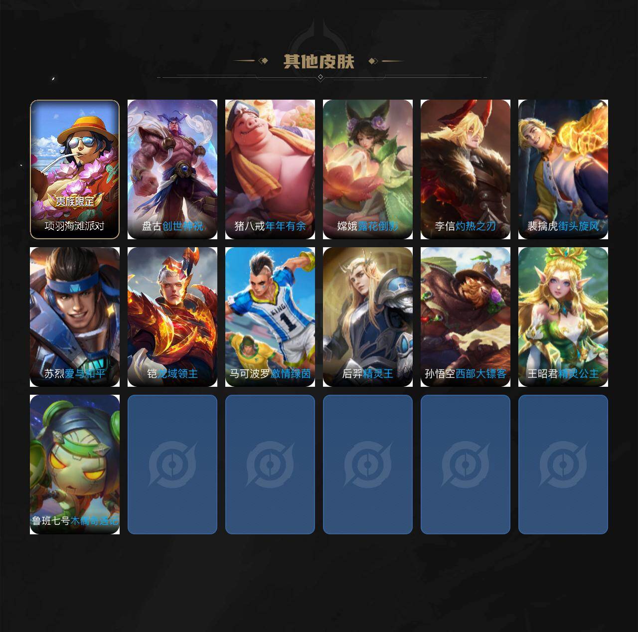 【限定皮肤】:杨戬破阵退雄兵,狄仁杰阴阳师,赵云皇家上将,妲己热情桑巴,元歌无心,狄仁杰魔术师,项羽海滩派对,鬼谷子五谷丰年,米莱狄
