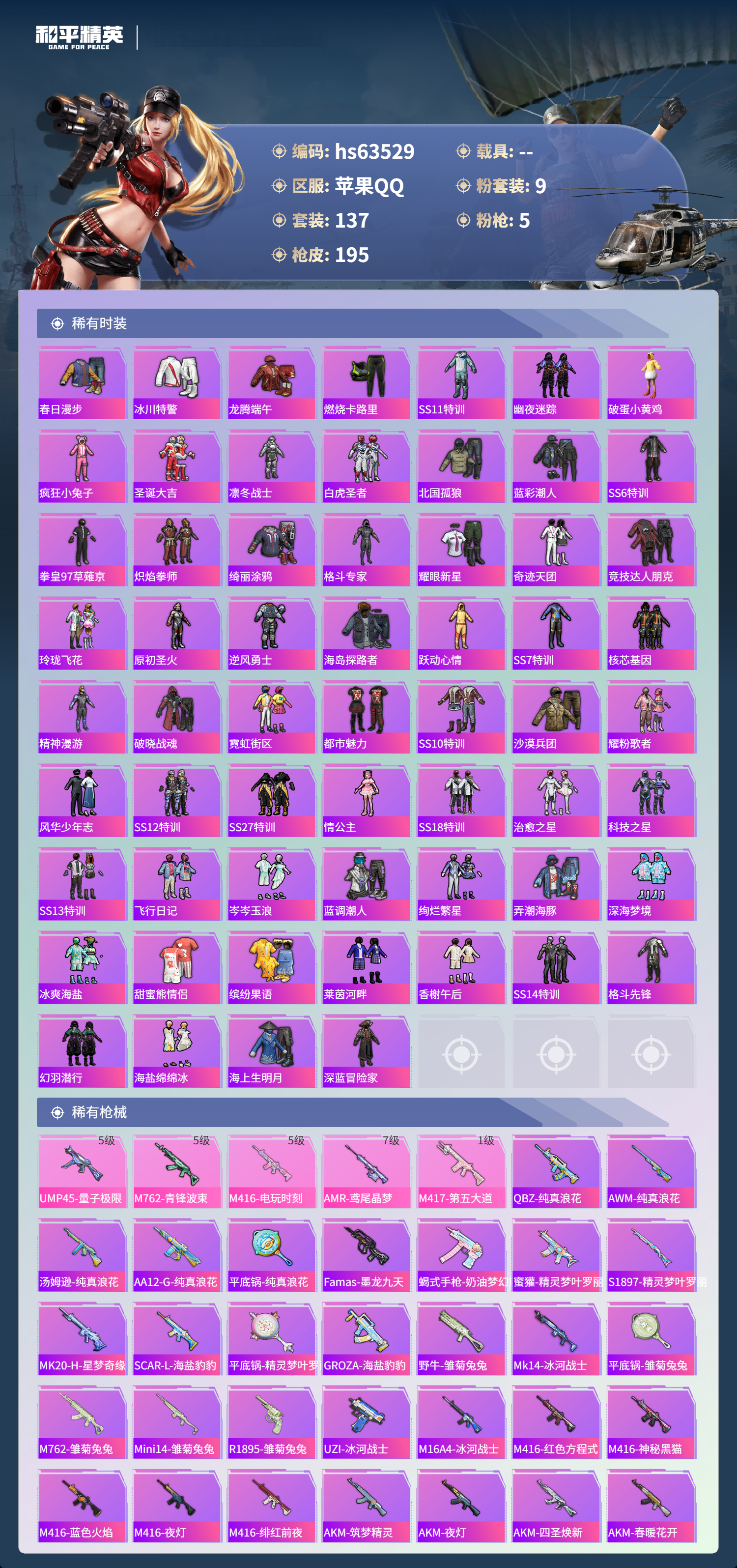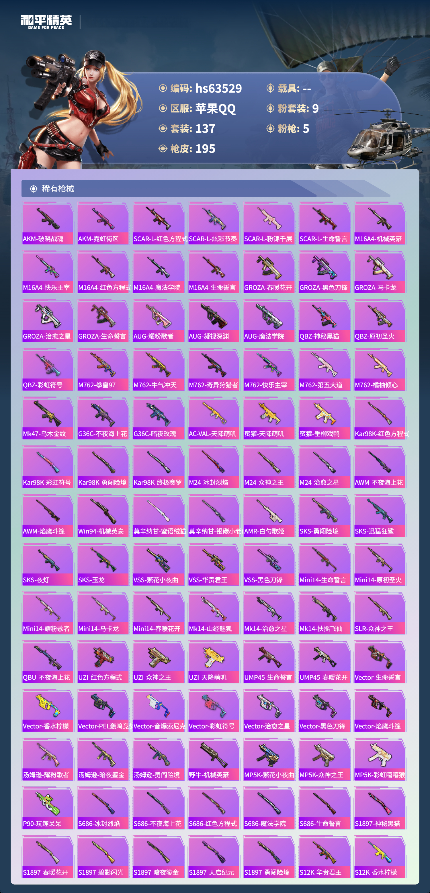 hs63529 苹果手Q-5王牌印记-9粉装-5特效枪-61831热力值-137套装-195枪皮-2卓越印记-2传奇印记