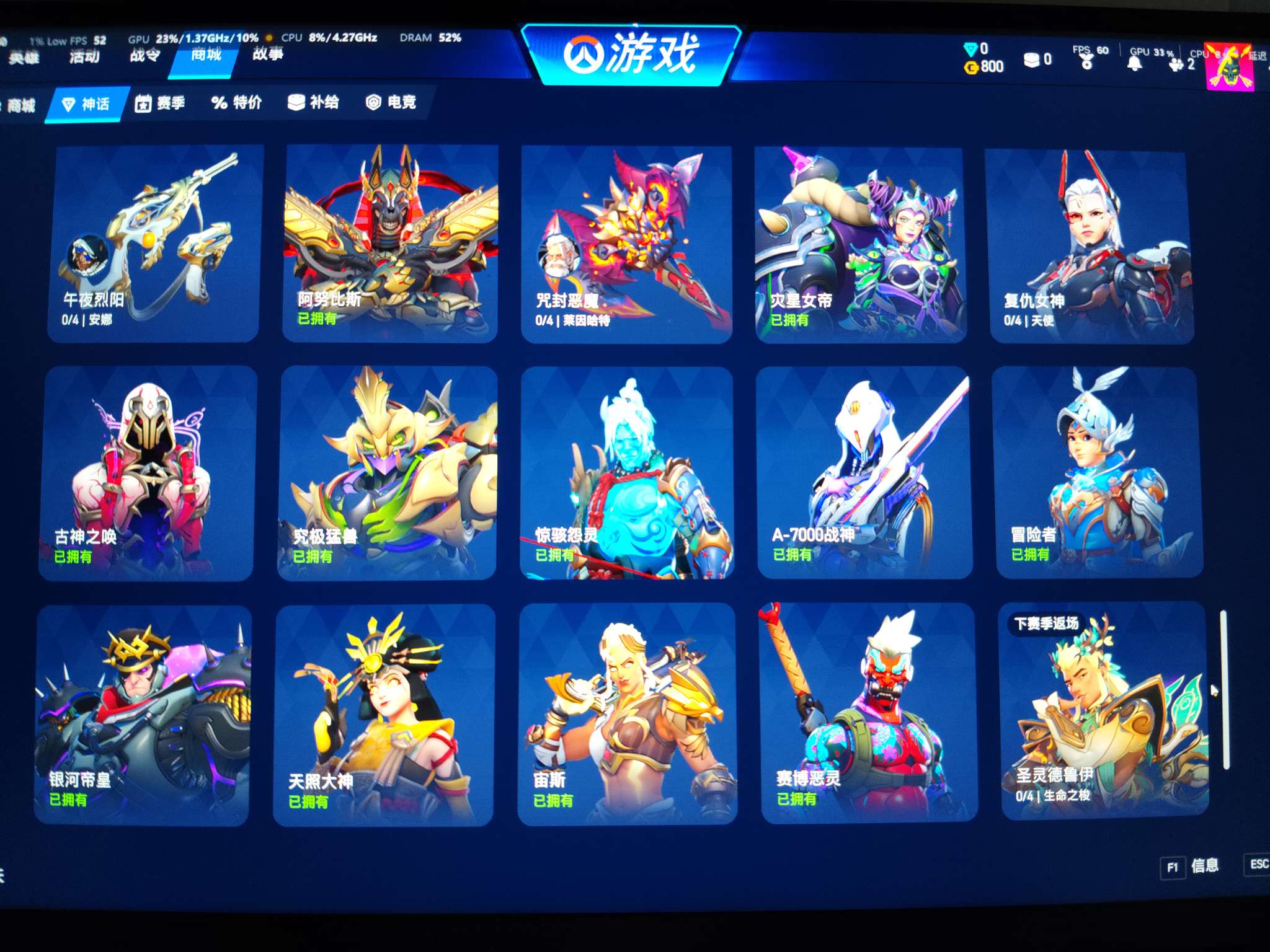 神话皮肤都是满级的,有源氏,铁拳武器贴图,还有800金币,把免费战令的打了正好开高级,可小刀