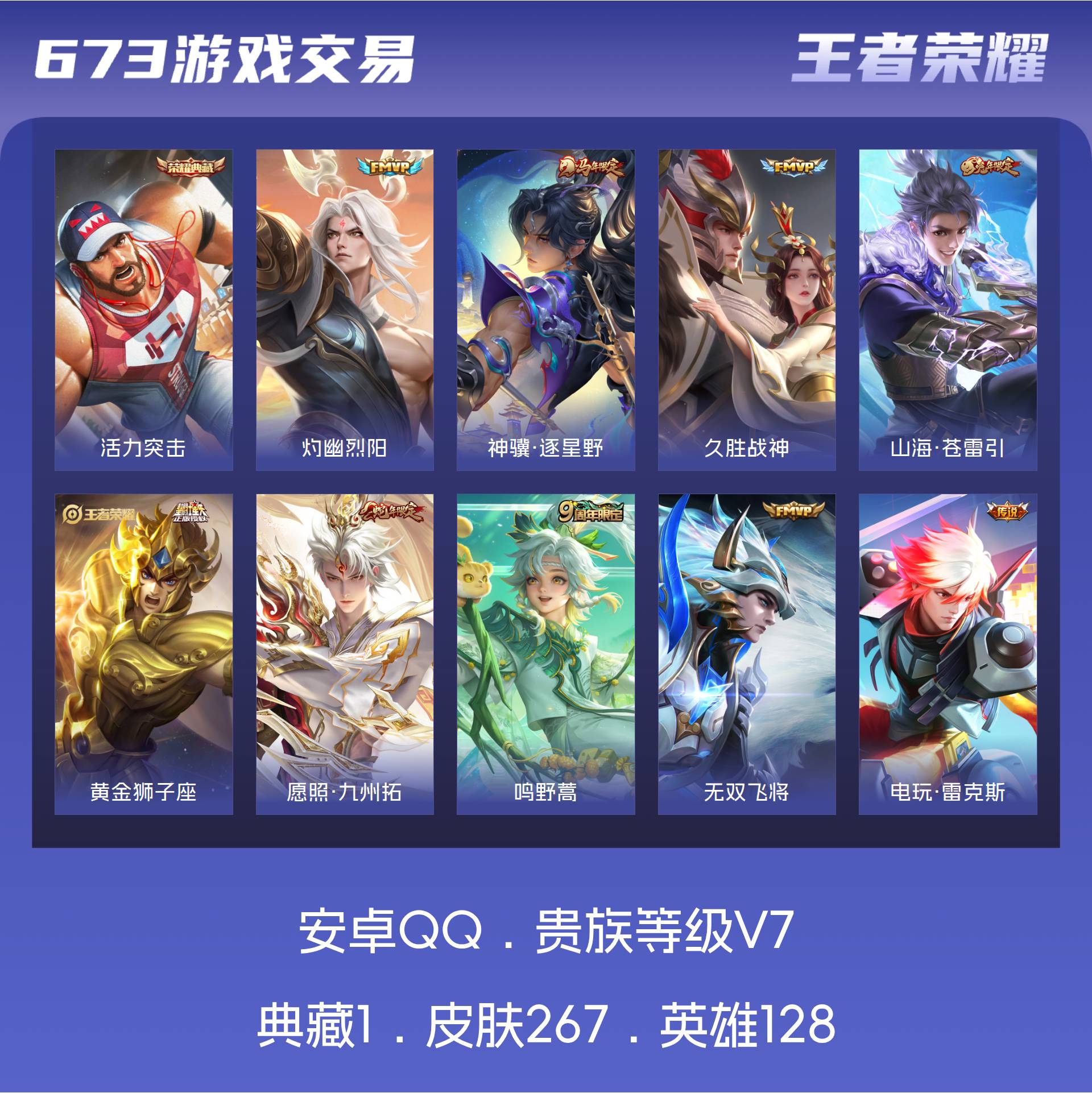 安卓QQ/荣耀王者/267皮肤/128英雄/1典藏/0珍品无双/0无双/0珍品传说/16传说/80史