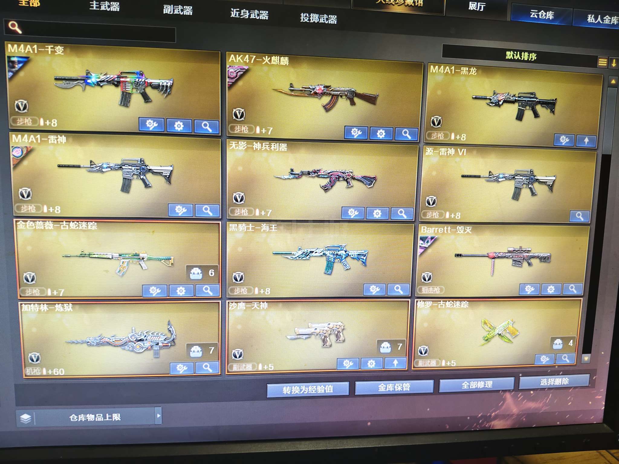 【热门武器】:HK417-朱雀,M200-幻神,QBZ-03-王者蔷薇,死亡之眼,M4A1-黑骑士,汤姆逊-烈龙,加特林-炼狱,沙鹰-修罗*3