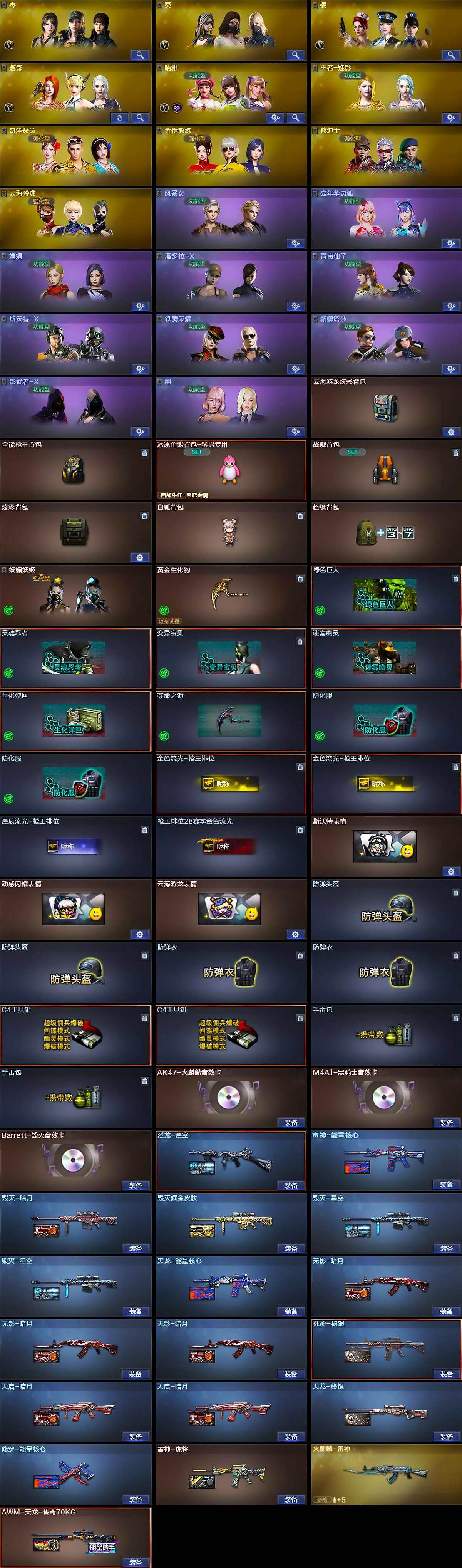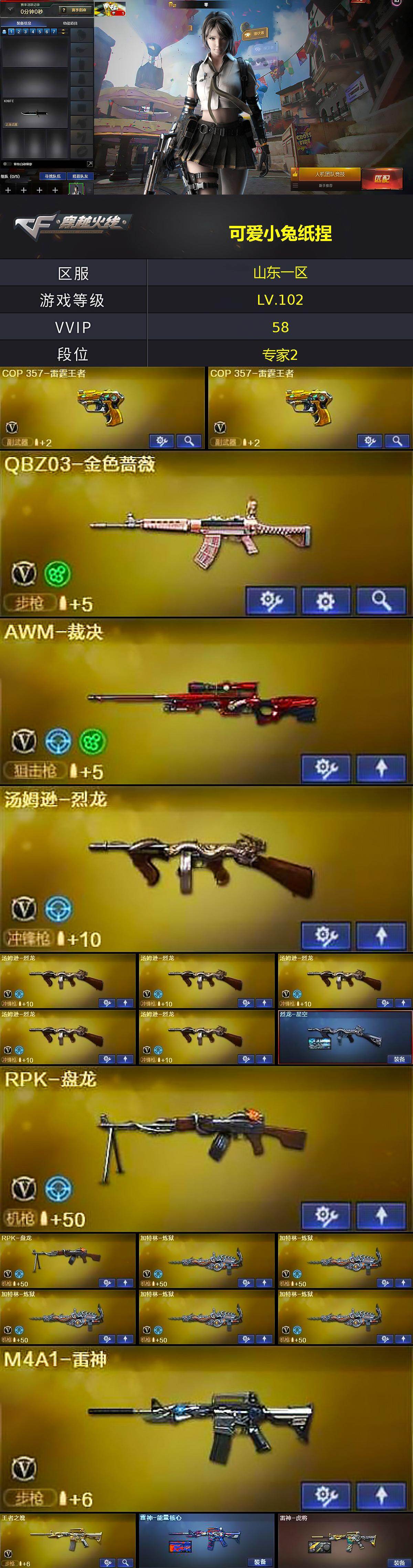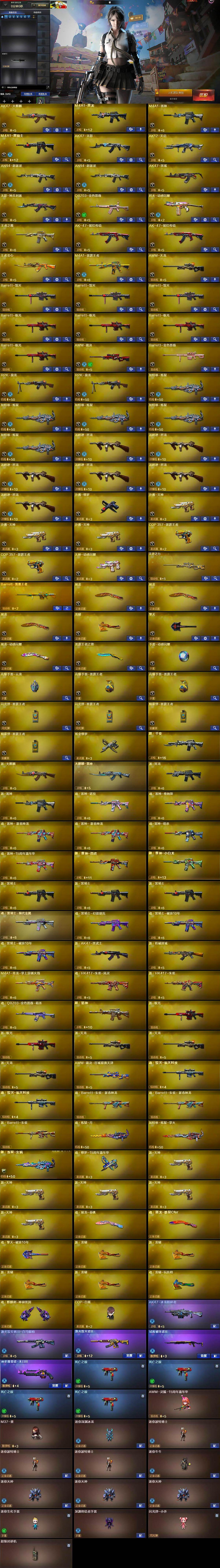 【热门武器】:QBZ03-金色蔷薇,死亡之眼*4,M4A1-黑骑士,汤姆逊-烈龙*6,RPK-盘龙*2,加特林-炼狱*5,降世魔童,COP-白鲨,沙鹰-修罗