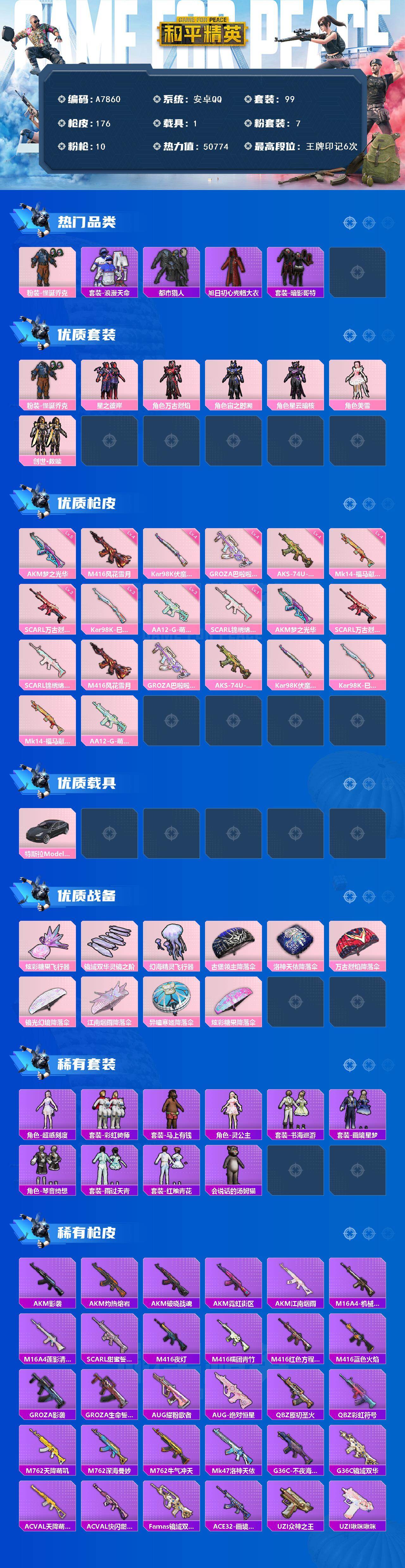 【A7860】安卓 【素材号 怪诞乔克/浪漫天命/都市猎人/暗影哥特/AKM-梦之光华(五级)/M416-风花雪月(四级)/特斯拉Model 3(冷光银)】手Q-7粉装-10特效枪-1载具-3粉色飞行器-50774热力值-6王牌印记-99套装-176枪皮