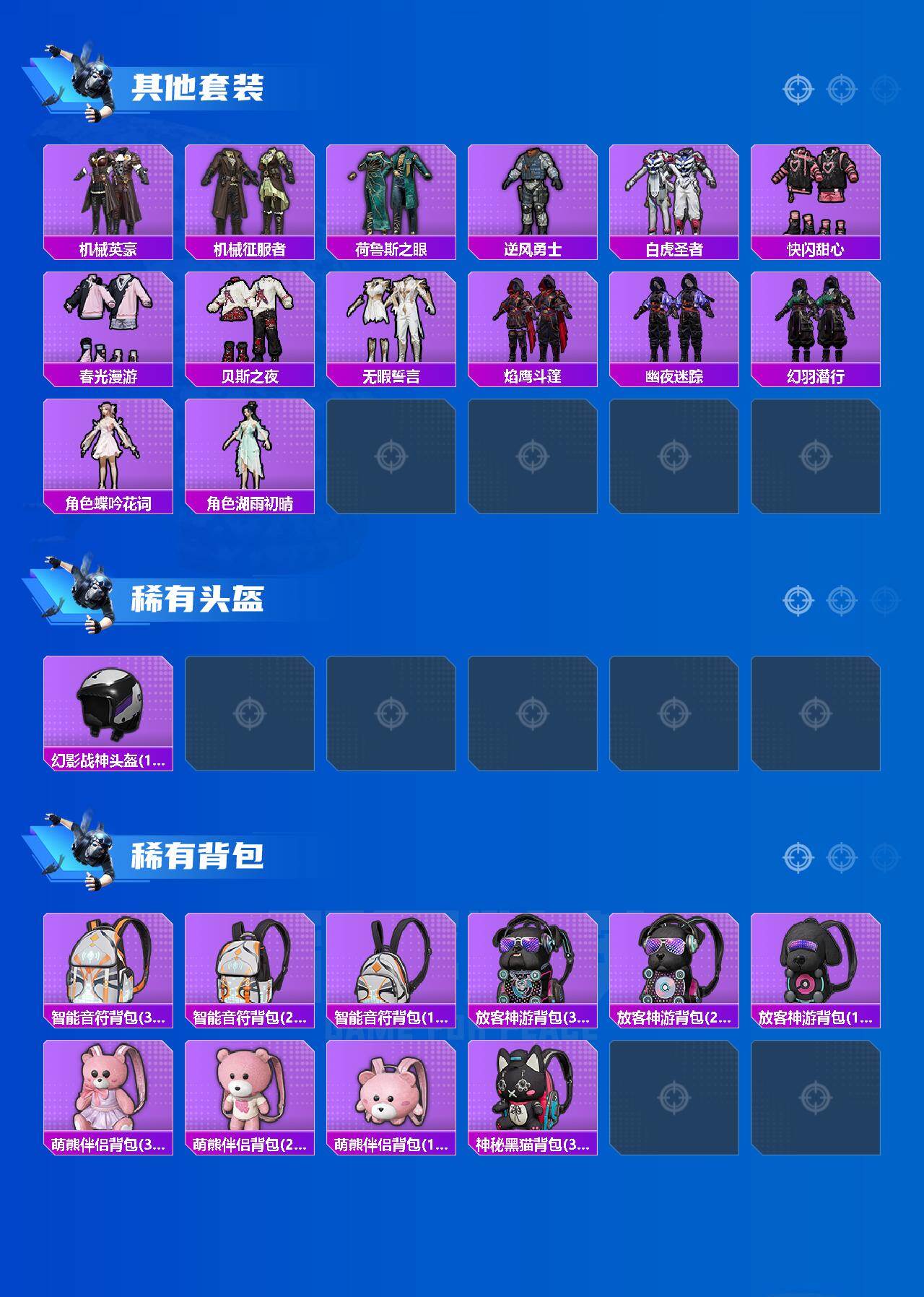 【粉色套装】:粉装-怪诞乔克,粉装-星之彼岸,角色-万古烈焰,角色-宙之时溯,角色-星云暗核,角色-美雪,套装-创世·救赎