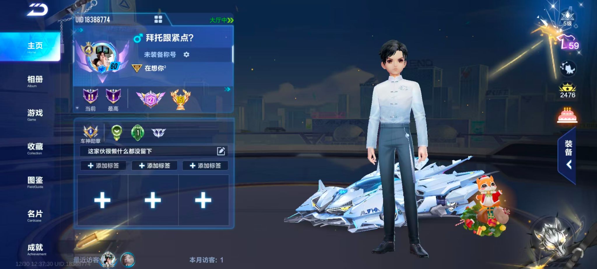 溯光+叮当花鼠A车数量9游戏等级60贵族等级4车皮肤数量2安