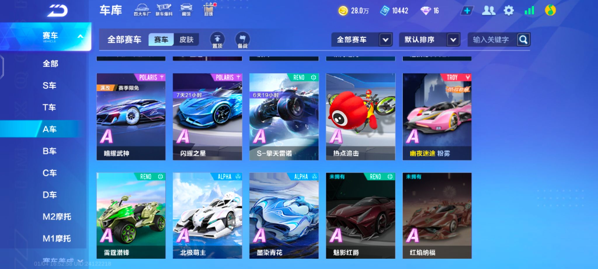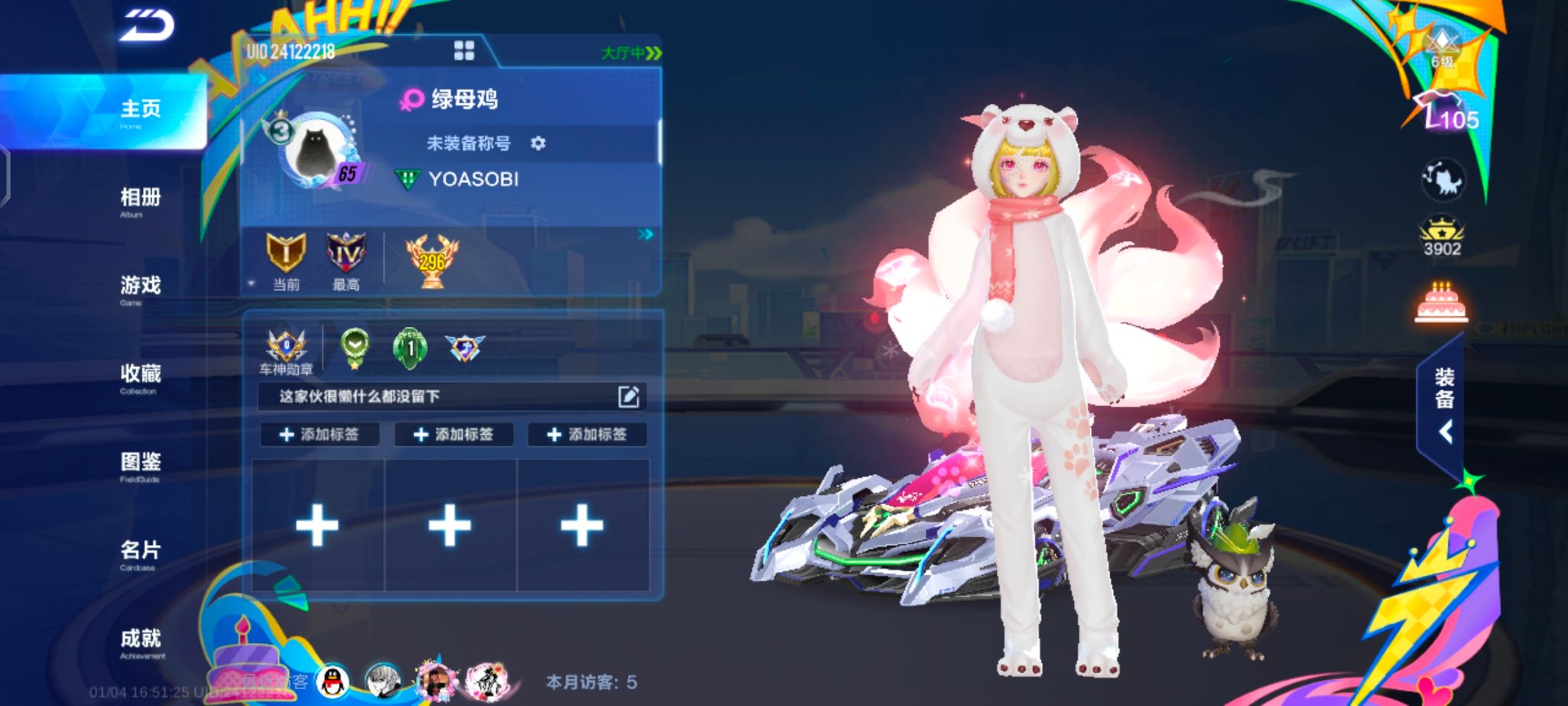 霆光+猫头鹰A车数量10游戏等级65贵族等级3车皮肤数量4安