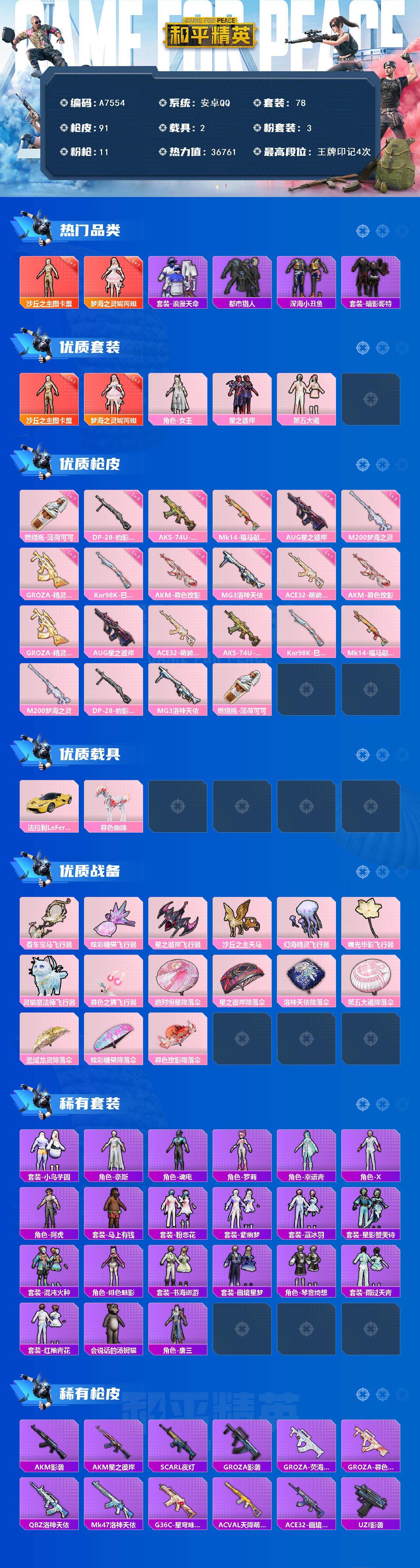 【A7554】安卓 【神装号 梦海之灵-妮芮妲(一级)/沙丘之主-图卡盟(一级)/浪漫天命/都市猎人/深海小丑鱼/暗影哥特/AKM-暮色玫影(三级)/法拉利LaFerrari(摩德纳黄)】手Q-2神装-3粉装-11特效枪-2载具-9粉色飞行器-36761热力值-4王牌印记-78套装-91枪皮