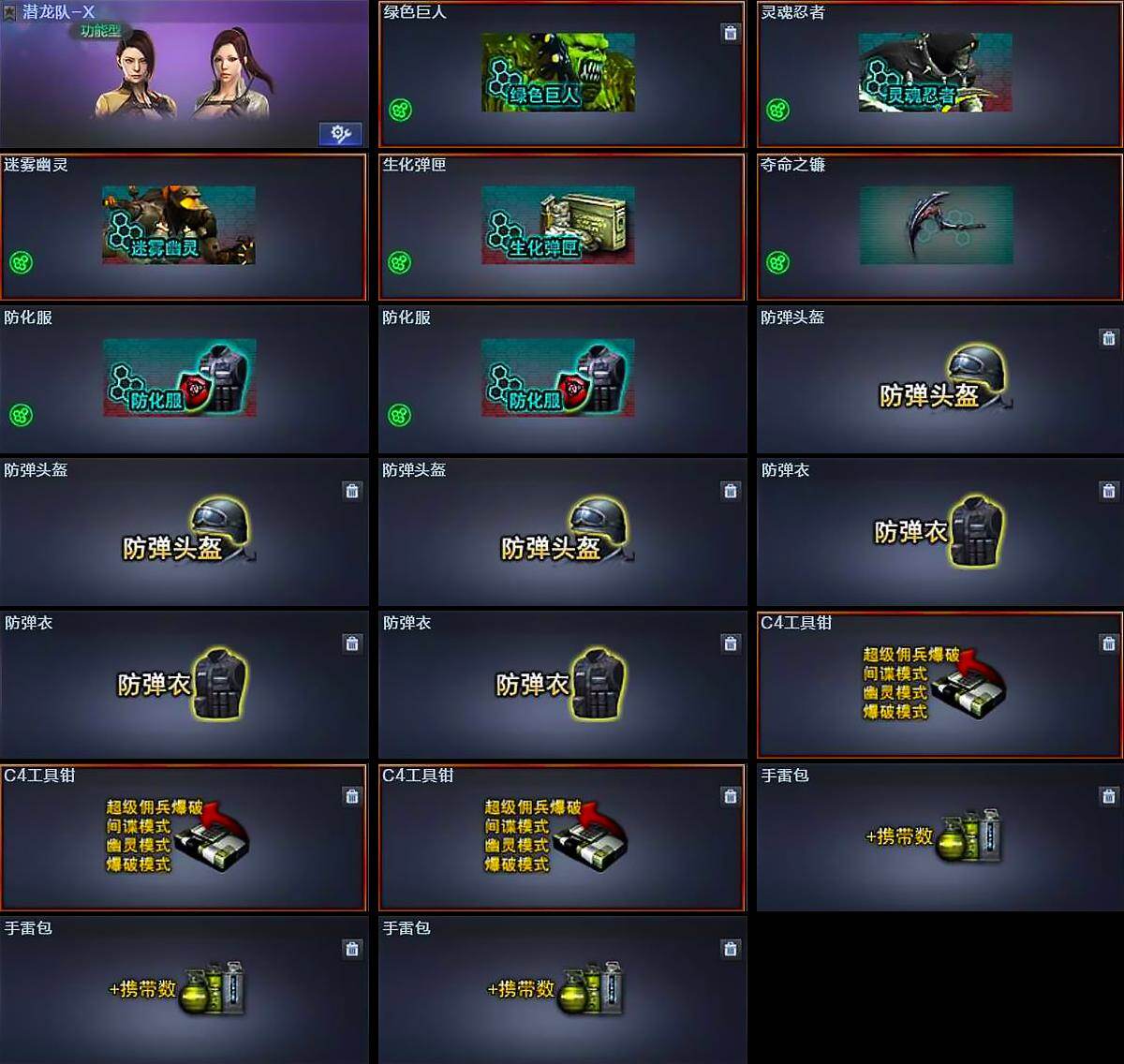 【道具】:绿色巨人,灵魂忍者,迷雾幽灵,生化弹匣,夺命之镰,防化服*2,防弹头盔*3,防弹衣*3,C