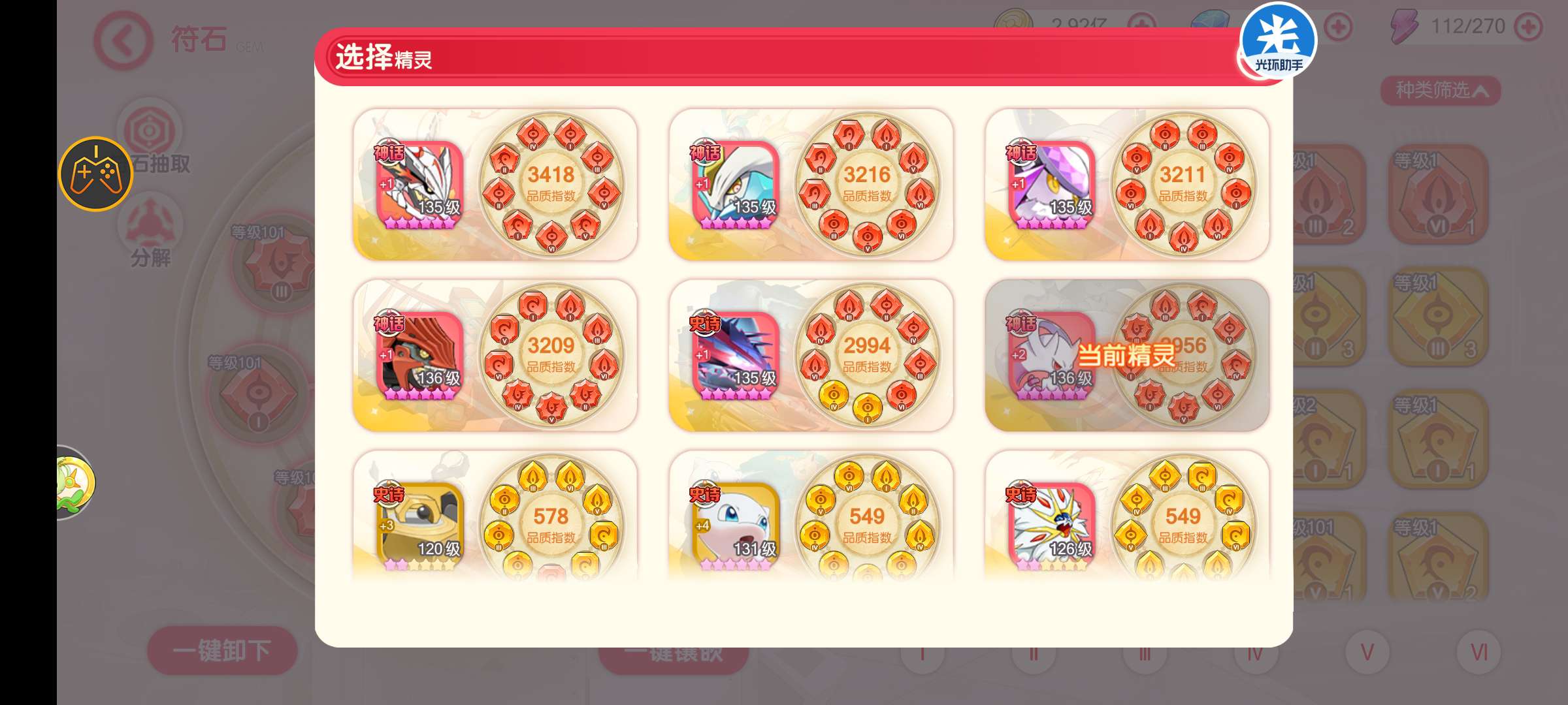 V16,多氪金橙携和氪金皮肤 。五神话精灵,2只满星史诗,5只8星史诗。1个6星,2个5星神兽。