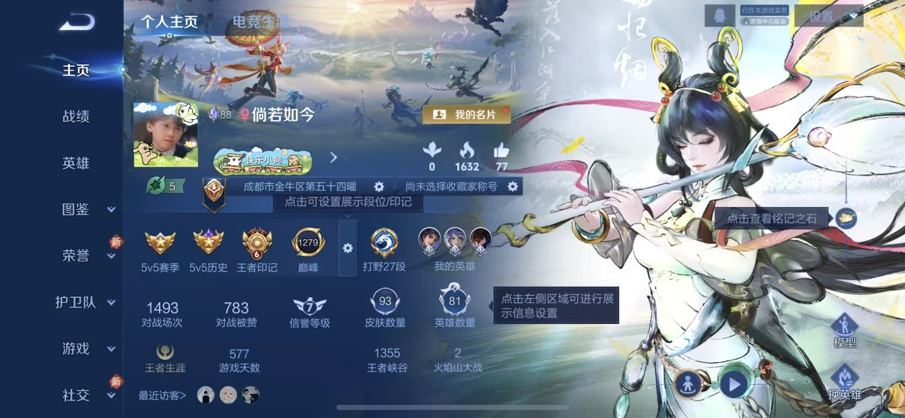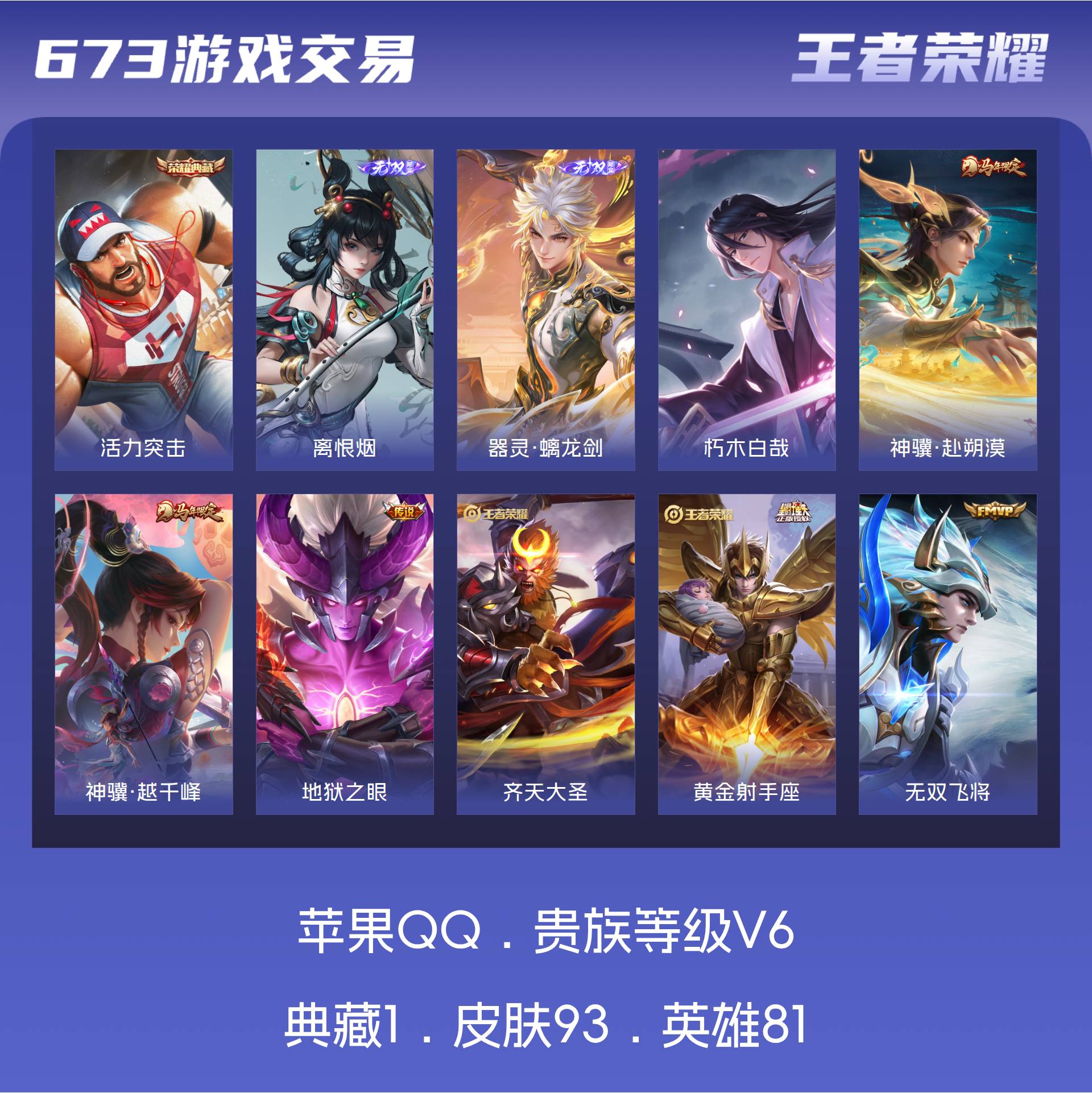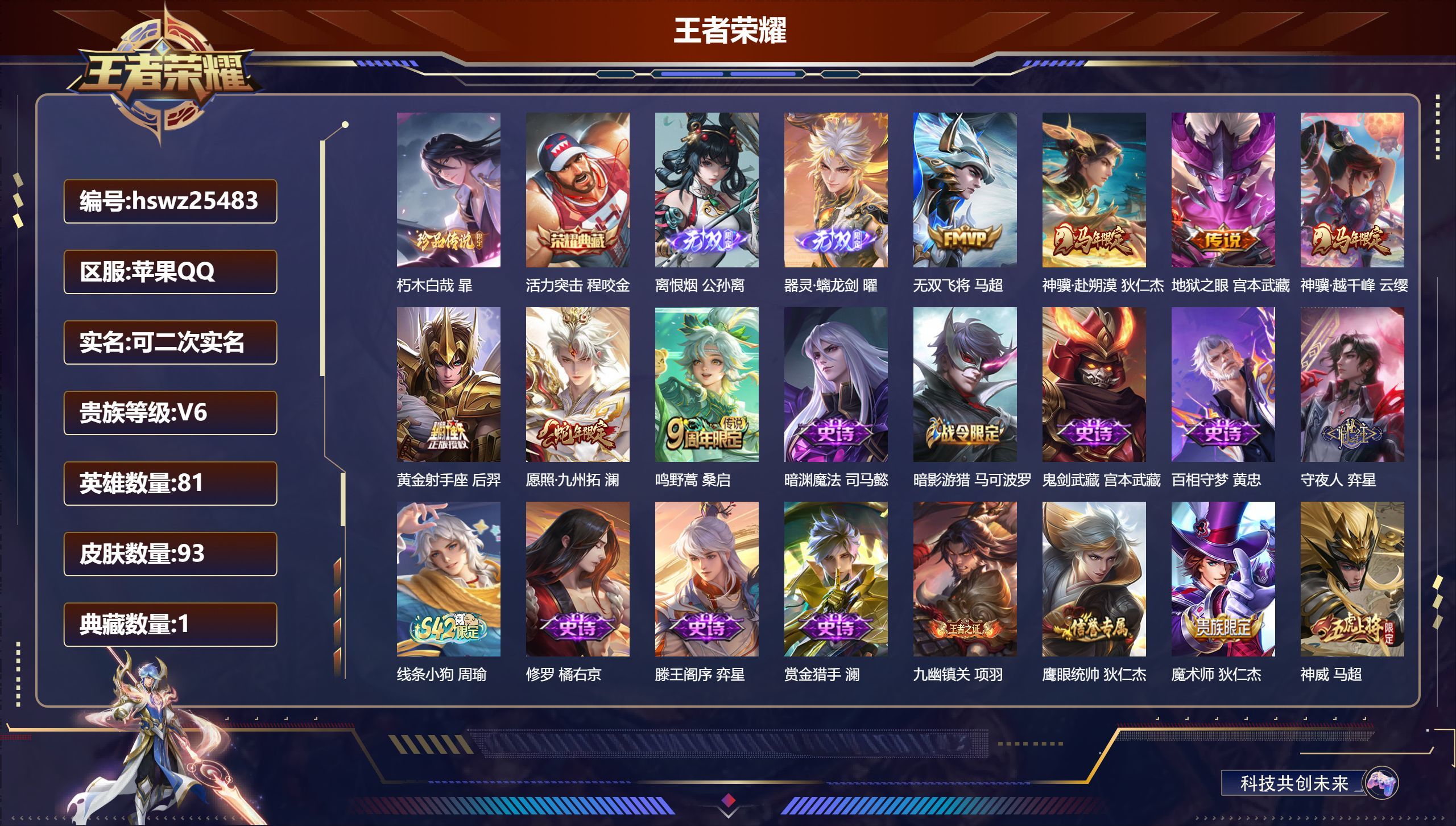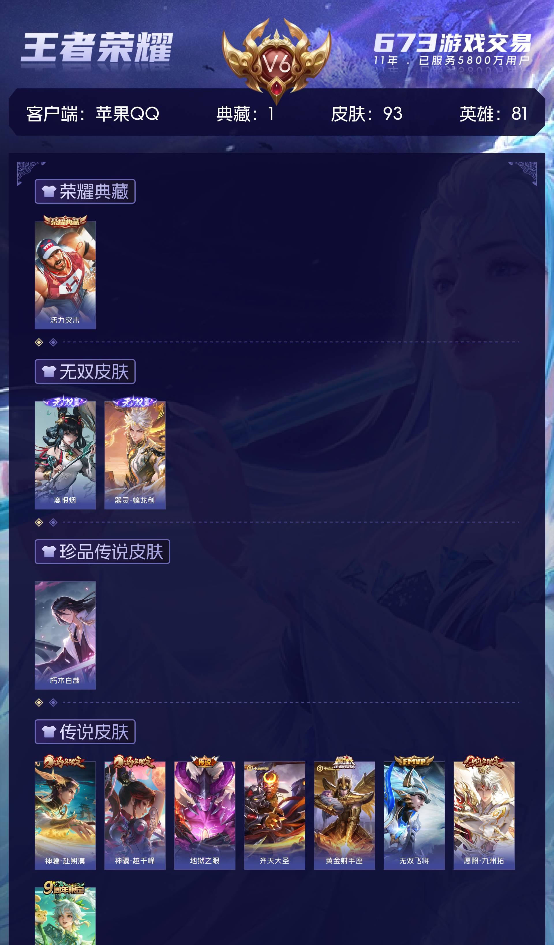 苹果QQ/最强王者/93皮肤/81英雄/1典藏/0珍品无双/2无双/1珍品传说/7传说/24史诗/6
