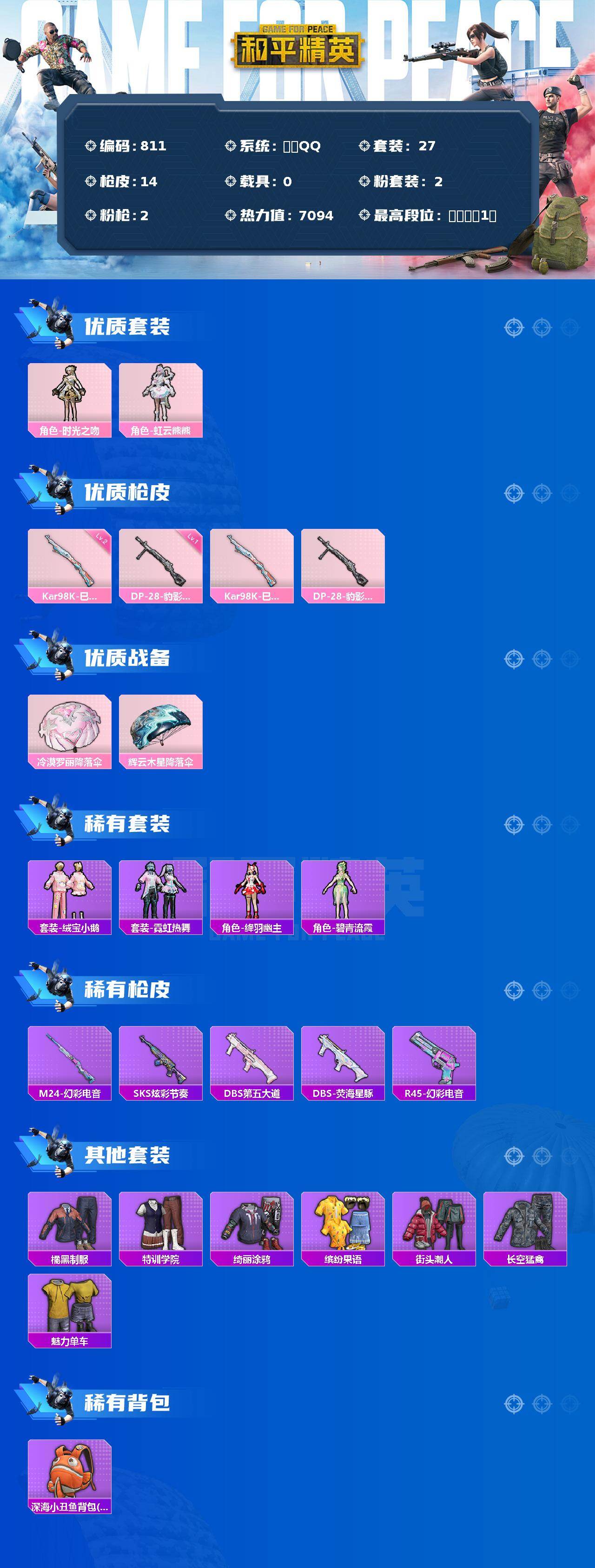 苹果 手Q-2粉装-2特效枪-0载具-0粉色飞行器-7094热力值-1王牌印记-27套装-14枪皮