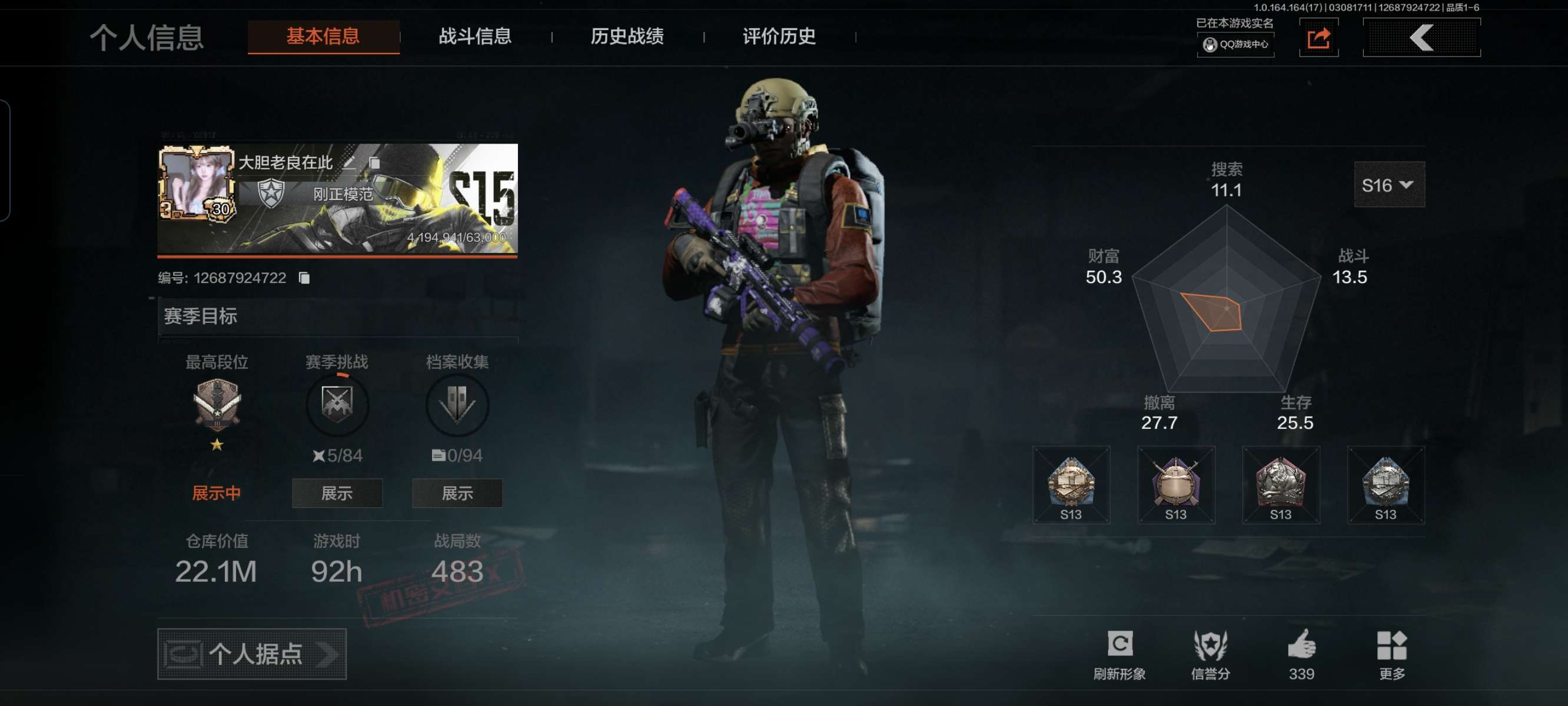 总资产22M36个大金科恩币1千多万98个枪皮镇天雷MK2手榴弹皮肤H416蓝色咆哮金皮和电台钥匙