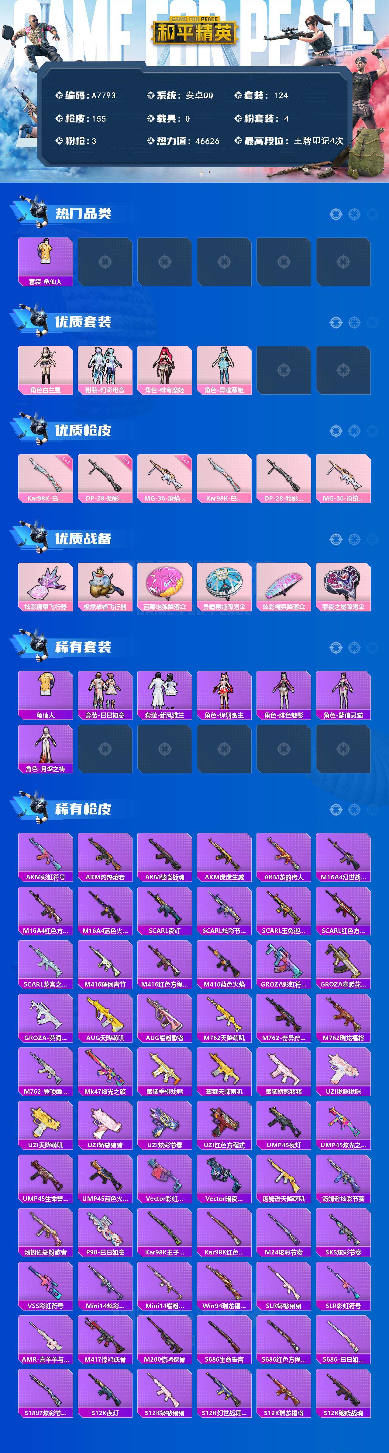 【A7793】安卓【小号 龟仙人/异瞳寒姬/Kar98K-巳巳如意(五级)/DP-28-豹影疾电(五级)/MG-36-沧焰双生(五级)】 手Q-4粉装-3特效枪-0载具-2粉色飞行器-46626热力值-4王牌印记-124套装-155枪皮