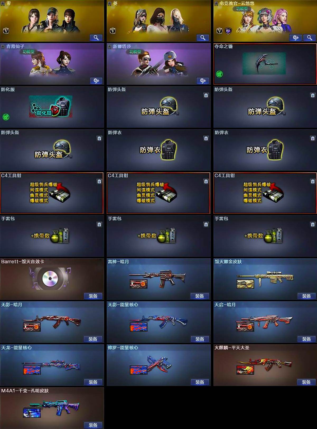 【皮肤】:雷神-暗月,火麒麟-平天大圣,毁灭耀金皮肤,M4A1-千变-孔明皮肤,无影-暗月,无影-能量核心,天启-暗月,天龙-能量核心,修罗-能量核心