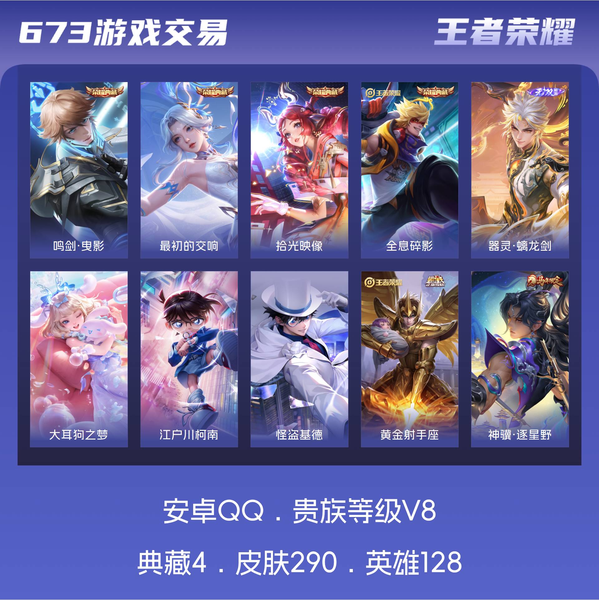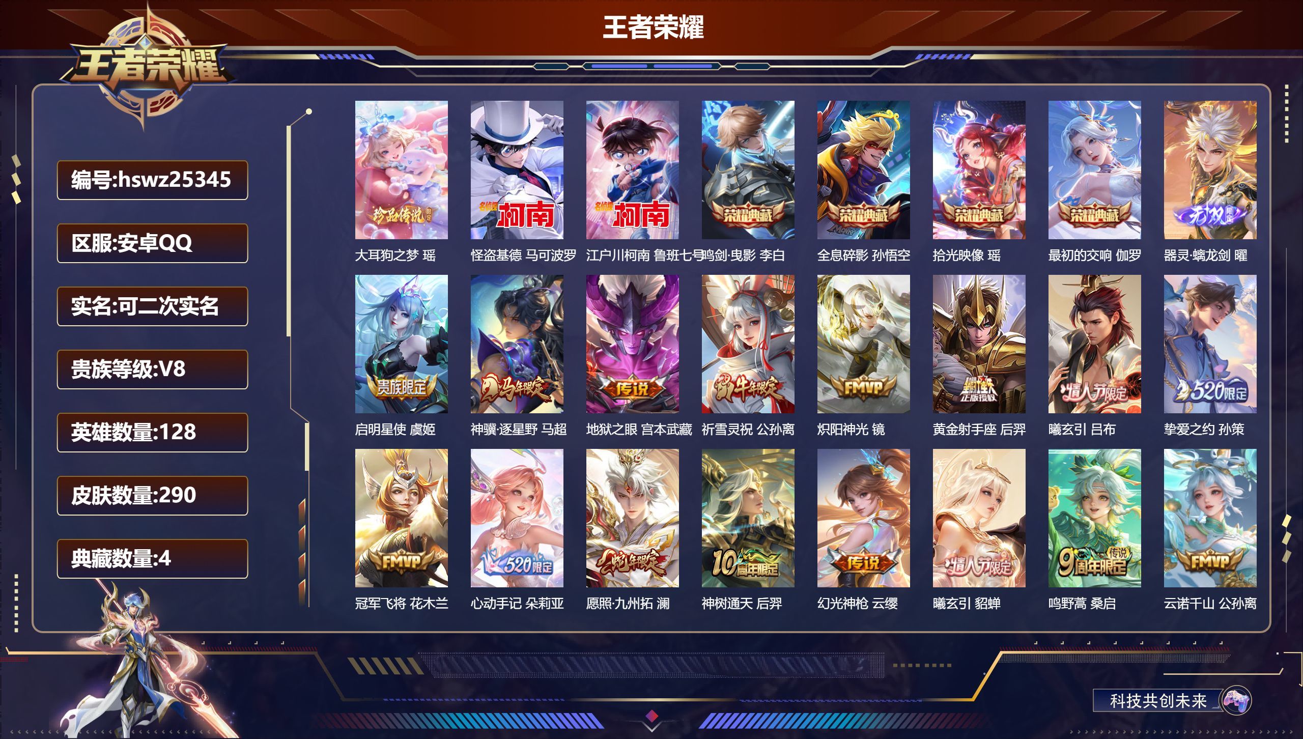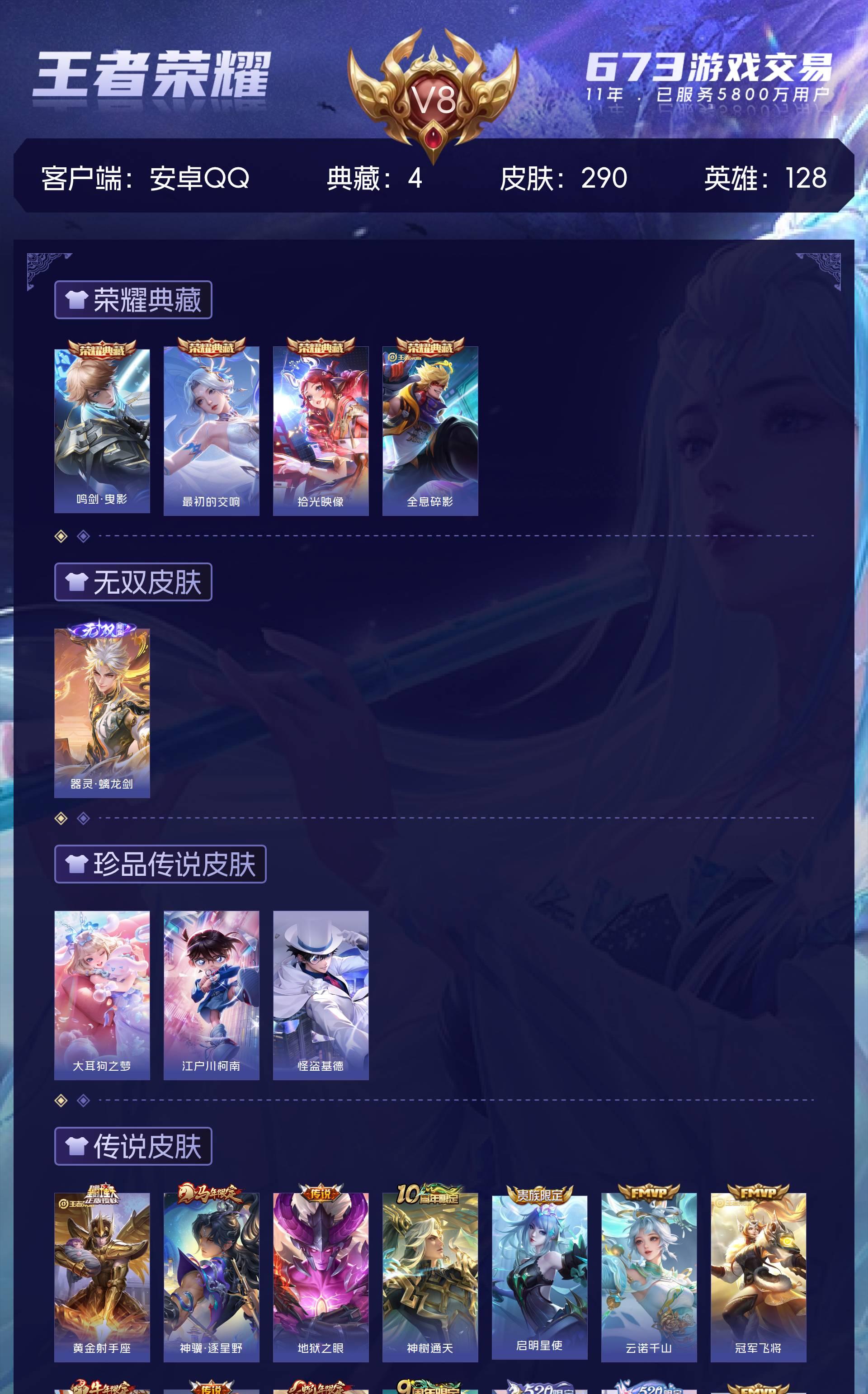 安卓QQ/至尊星耀/290皮肤/128英雄/4典藏/0珍品无双/1无双/3珍品传说/16传说/88史