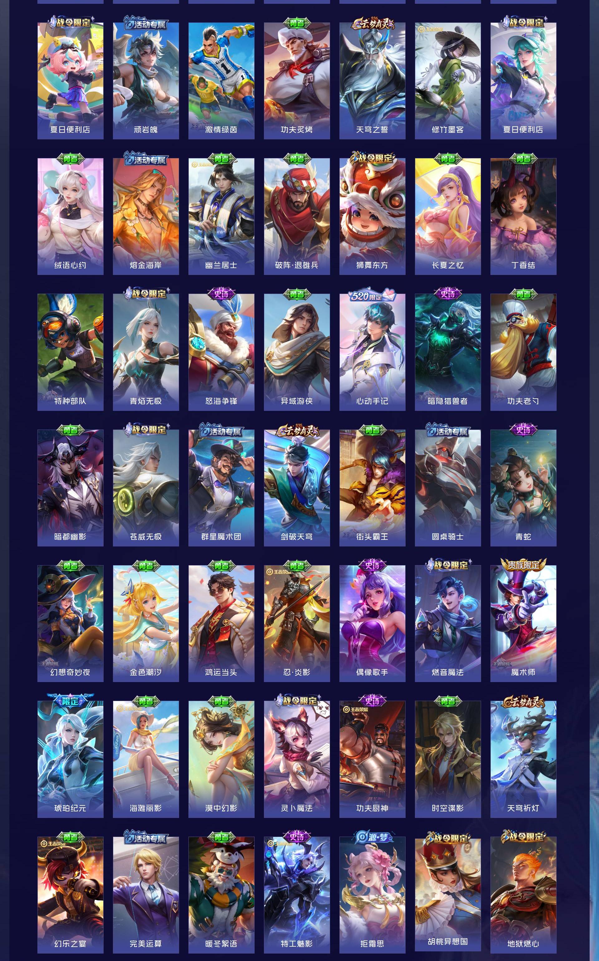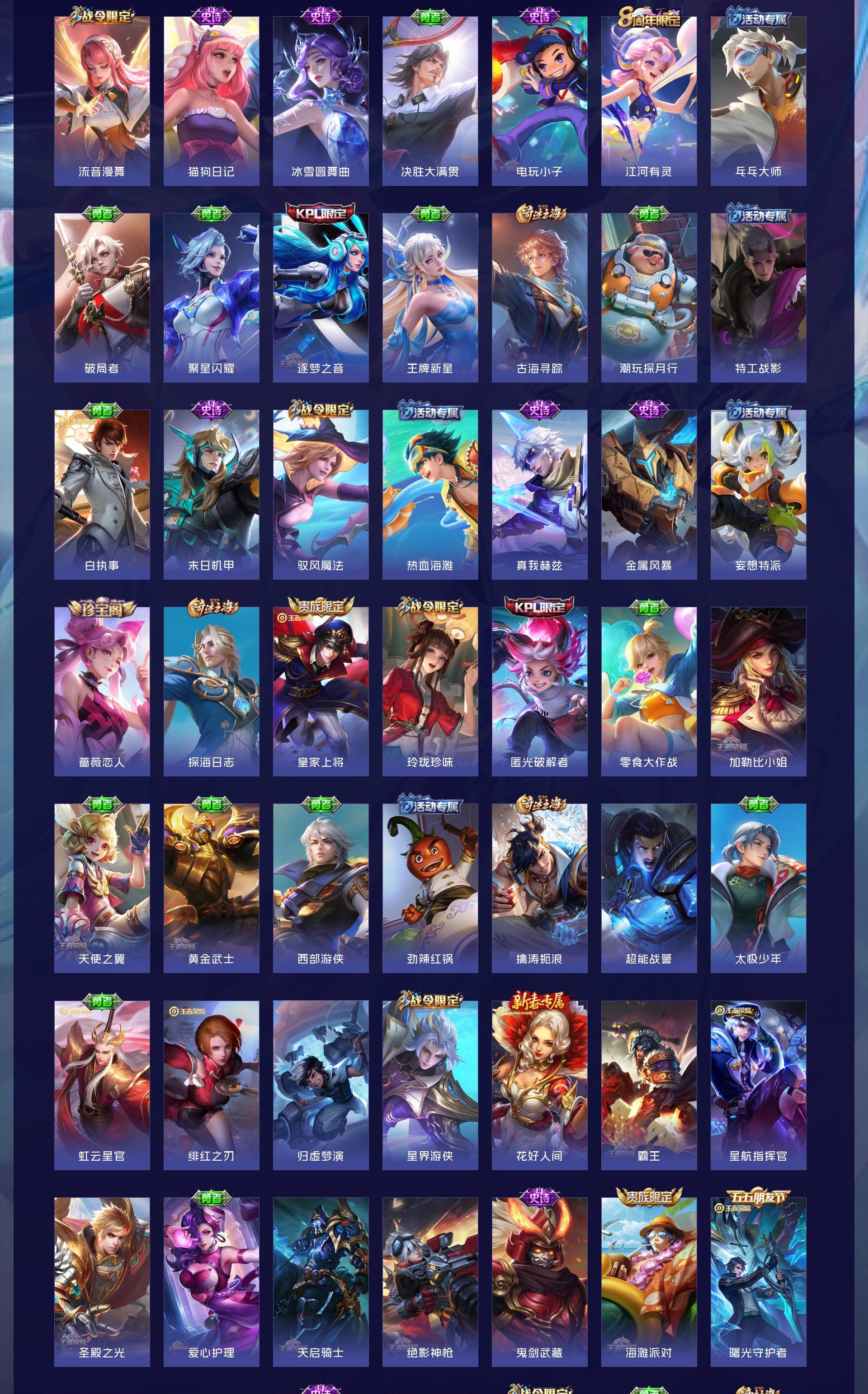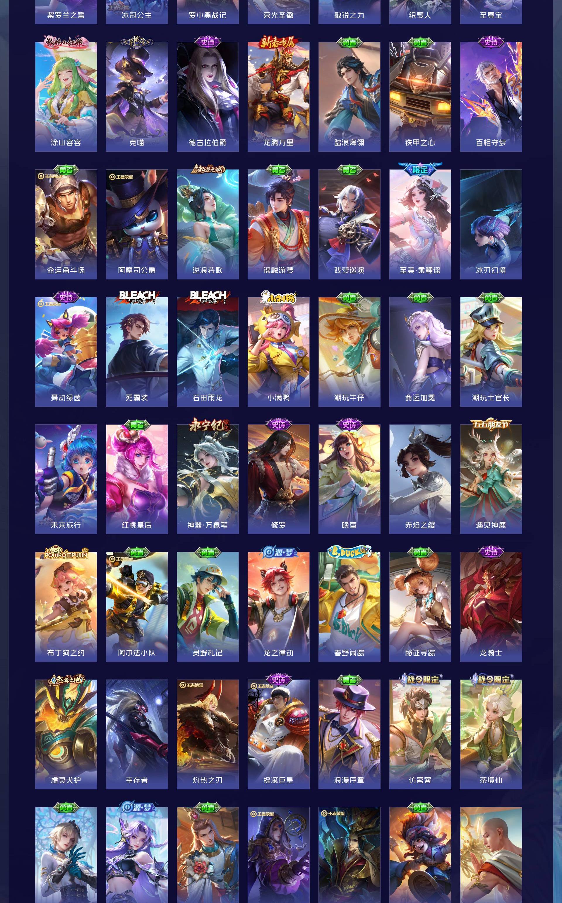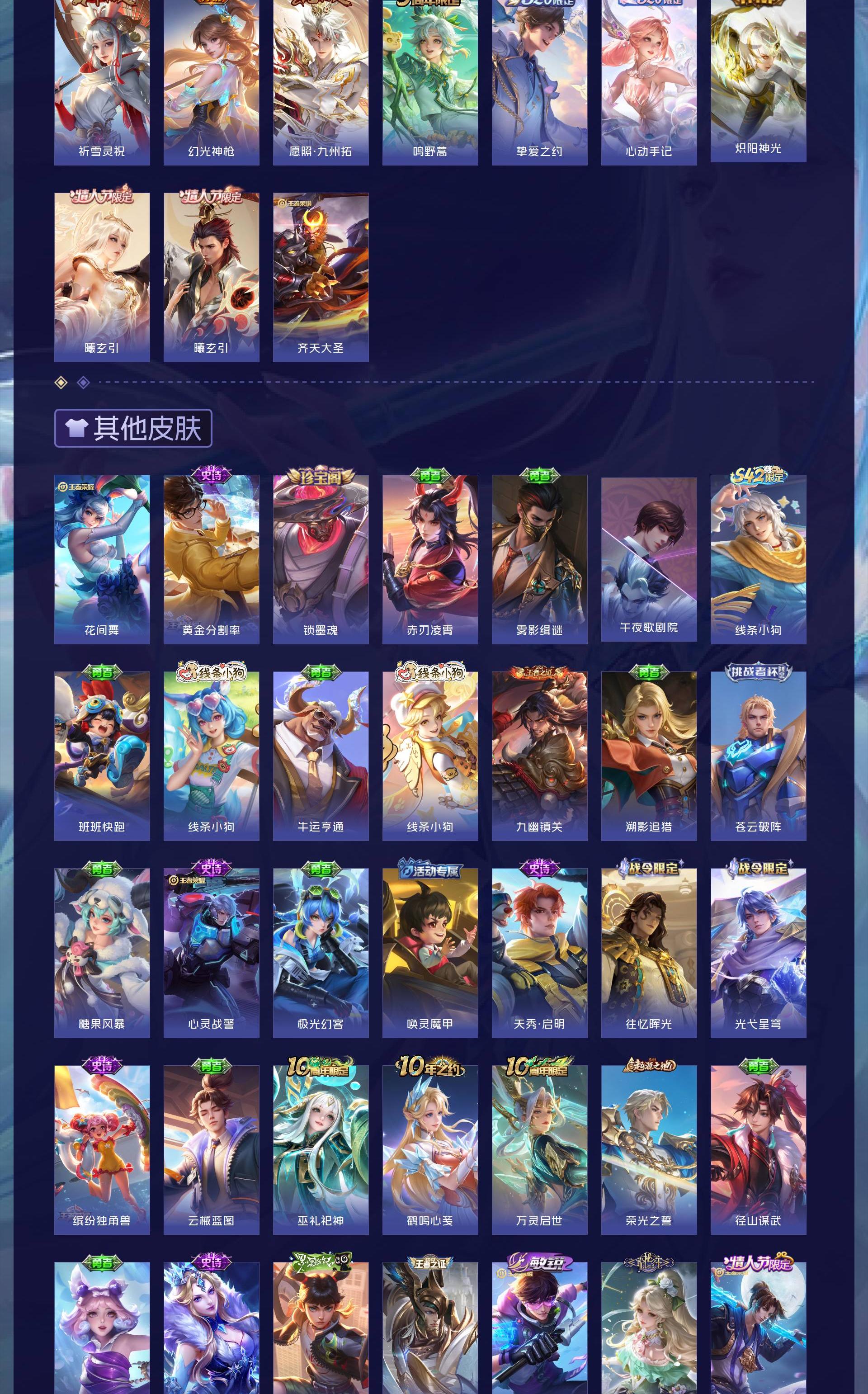 V8 皮肤290 英雄128 至尊星耀 荣耀典藏4 无双皮肤1 珍品传说3 传说17 其他皮肤271