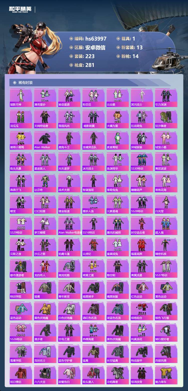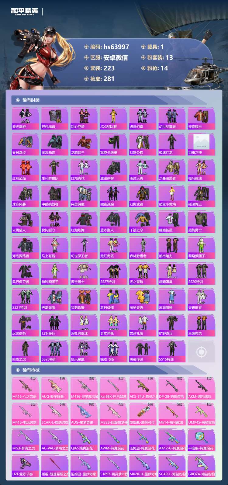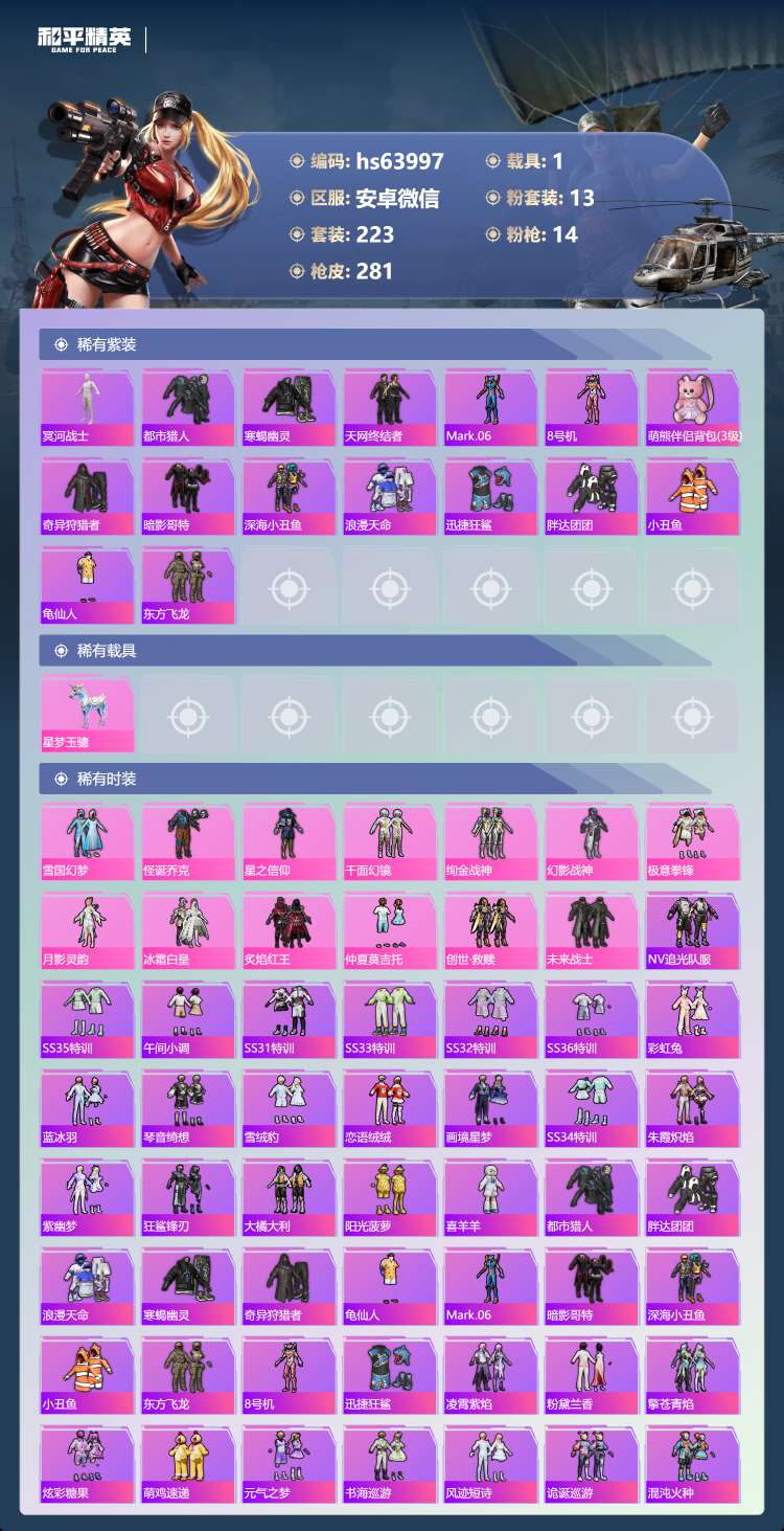 hs63997 安卓微-10王牌印记-有战神框-13粉装-14特效枪-1载具-92733热力值-2